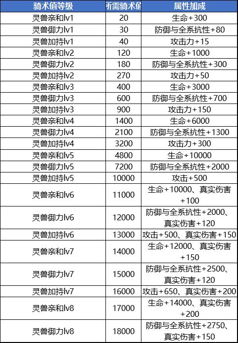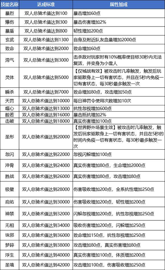 骑术值技能:根据装备的双人坐骑的累计骑术值,获得的被动属性加成技能。可以为角色提供海量战力和属性。