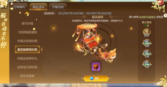 2、开服三天开的星辰猫辇,很划算,实测一般一百多就能凑齐碎片,算下来是性价比很高的金色双人坐骑,有条件的都建议整一个,后面没有这么便宜的了;