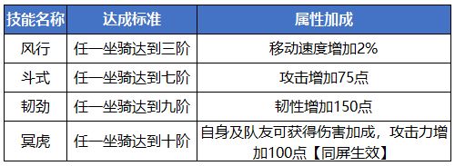 品阶技能:当装备的任意双人坐骑到达相应品阶,即可解锁相应的技能。