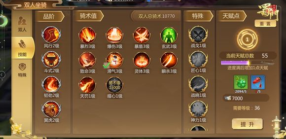 双人坐骑的技能就不仅只有骑术值相关的,还有品阶和特殊坐骑所带来的技能,同时技能可以通过技能点数进行升级。