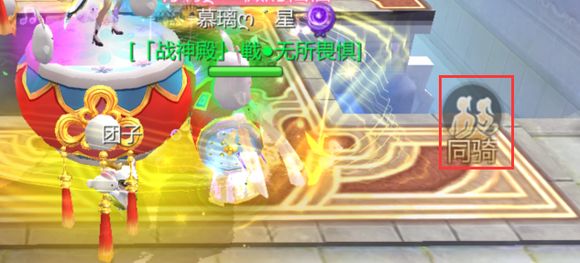 双人坐骑特殊的一点就是可以邀请其他人跟你一同乘坐啦,在双方靠近后,就可以看到屏幕中出现的同骑的标志。