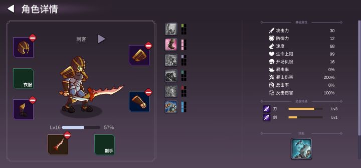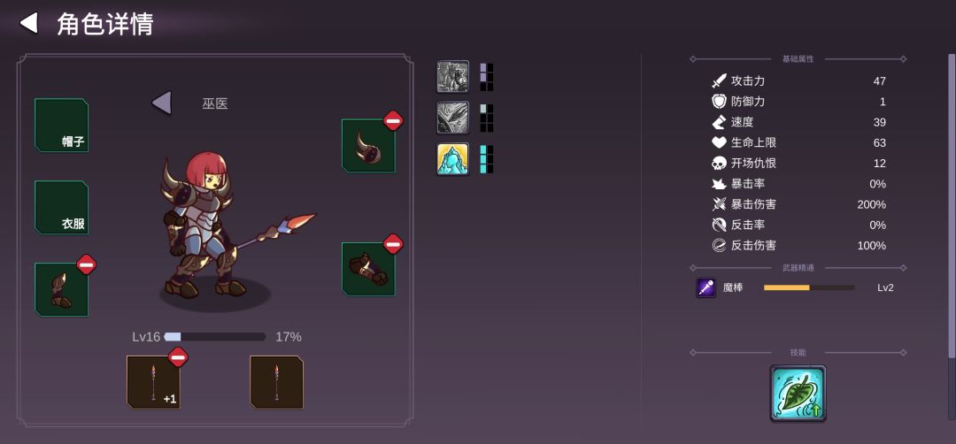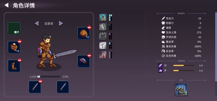第二关难度也不大,在第一关的基础上补全阵容,蛮霸者可以用骑士二号(可能会缺输出)或弓箭法师(培养不过来也保护不过来,第三关容易掉点)代替,但蛮霸者永远是最优解。巫医作为一个不吃治疗效果的奶,培养成本极低单体、奶量极大,是蛮霸者的专职奶奶,一定要在第二关找到。路线选择武器问号防具优先,宝石金币(我之前很喜欢拿金币,但是转念一想随便一件装备卖了都有两金,金币瞬间就不香了)次之。防具选择加血套给蛮霸者,加速套给刺客,剩下的破铜烂铁加攻击的给奶奶,加防御的给骑士。第二关boss也是随便打的,传说武器最好刷一把剑,实在刷不动的选盾,最后再考虑刀。