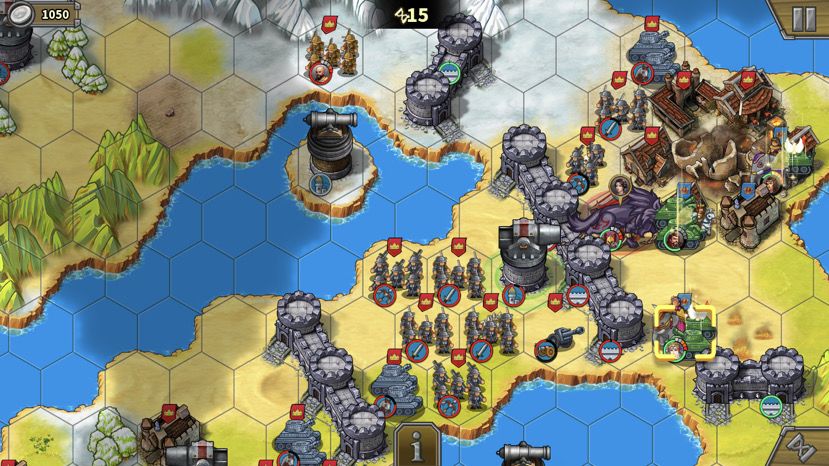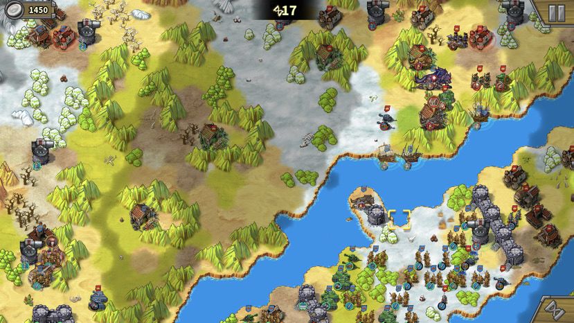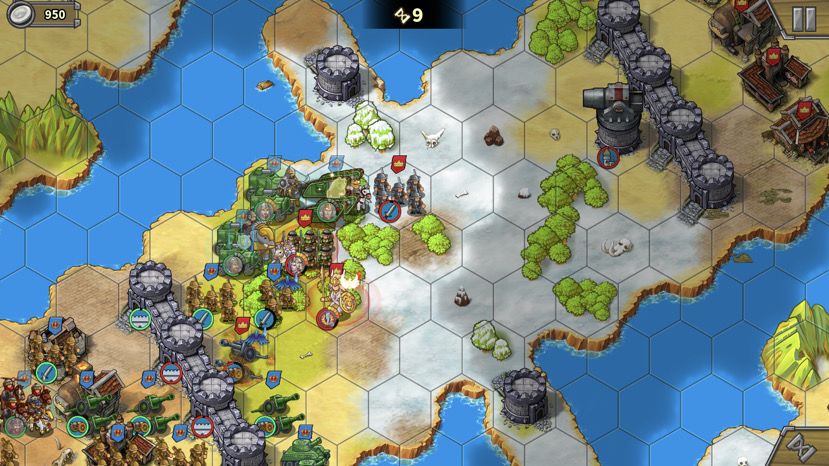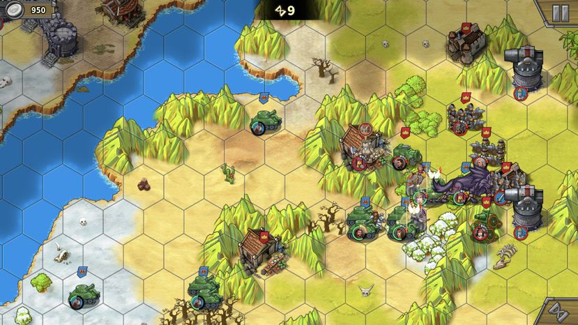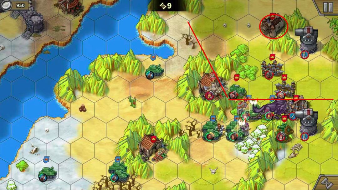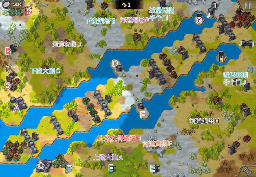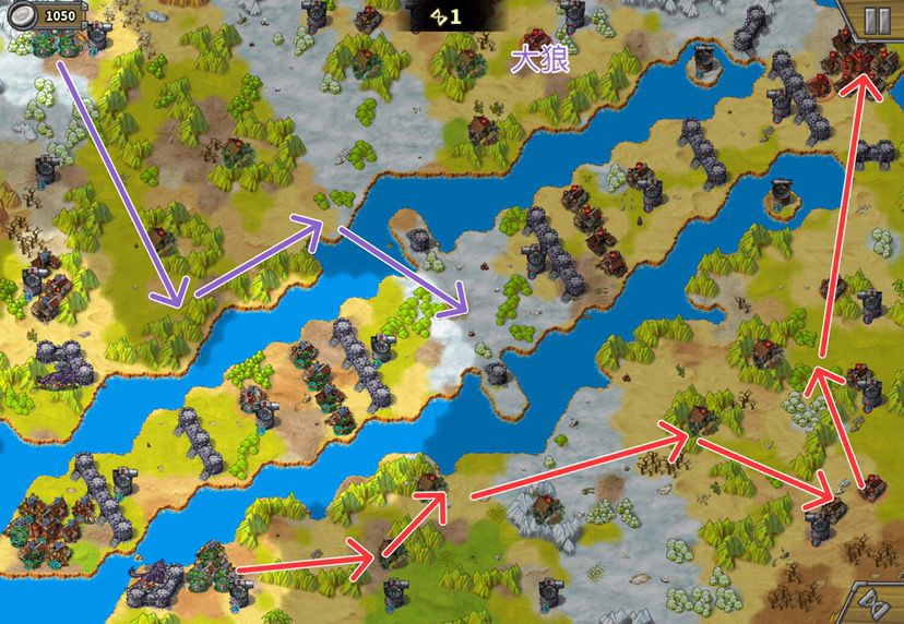 1. 主中路打法:上路下路开局后直接中路汇合,中推到底后,反向开花(分两路占领侧门临近红圈),下路右下红圈大狼占。——此打法因为不用分兵,操作单纯,但最大的问题是,中路城堡被摧毁后两边的侧门不开,主力需要二次下河上河,浪费大量回合,导致回合数不足。