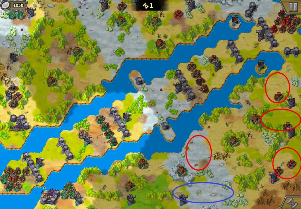1. 上路的敌军会动,在回合中后期,后面的敌人会往左下红圈集中(也有往右边侧门跑的,不过很少见),炮塔和大狼就可以消灭他们,所以左侧红圈可以不用守。而且,即是敌人把红圈占了,不会把周围兵营全占了,会留一个,我们只需要最后几回合造兵抢回来即可。而右边侧门处的红圈,因为大多数敌人都跑了,几乎没人守,我们只需要在最后几个回合派大狼抢占即可。