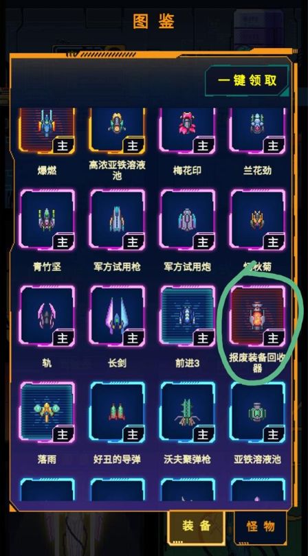 主武器:游戏的武器大部分都是垃圾,对清怪没有一点帮助。只有一个神器,就是下面图的报废装备回收器。为什么神?一是它血量血量越高,攻速就越快,二是子弹到顶后会落下,三是具备贯穿特性。不管对boss还是小怪,都能造成二次伤害,并且二次伤害是不用待在原地的。极大的方便我们躲避弹幕。