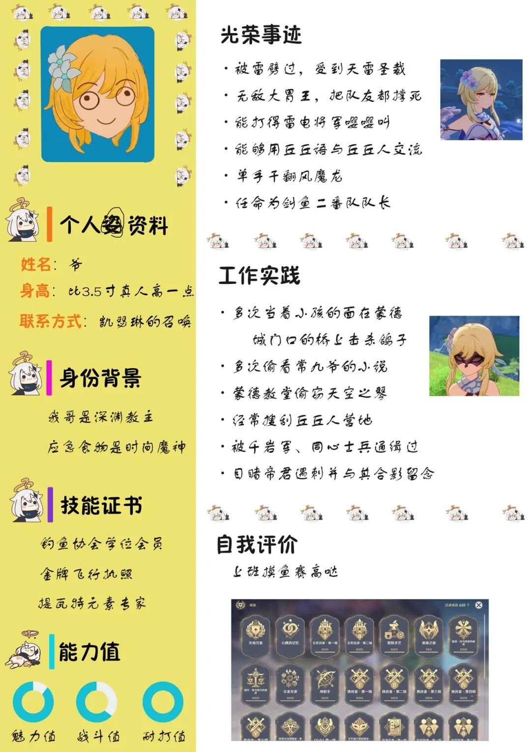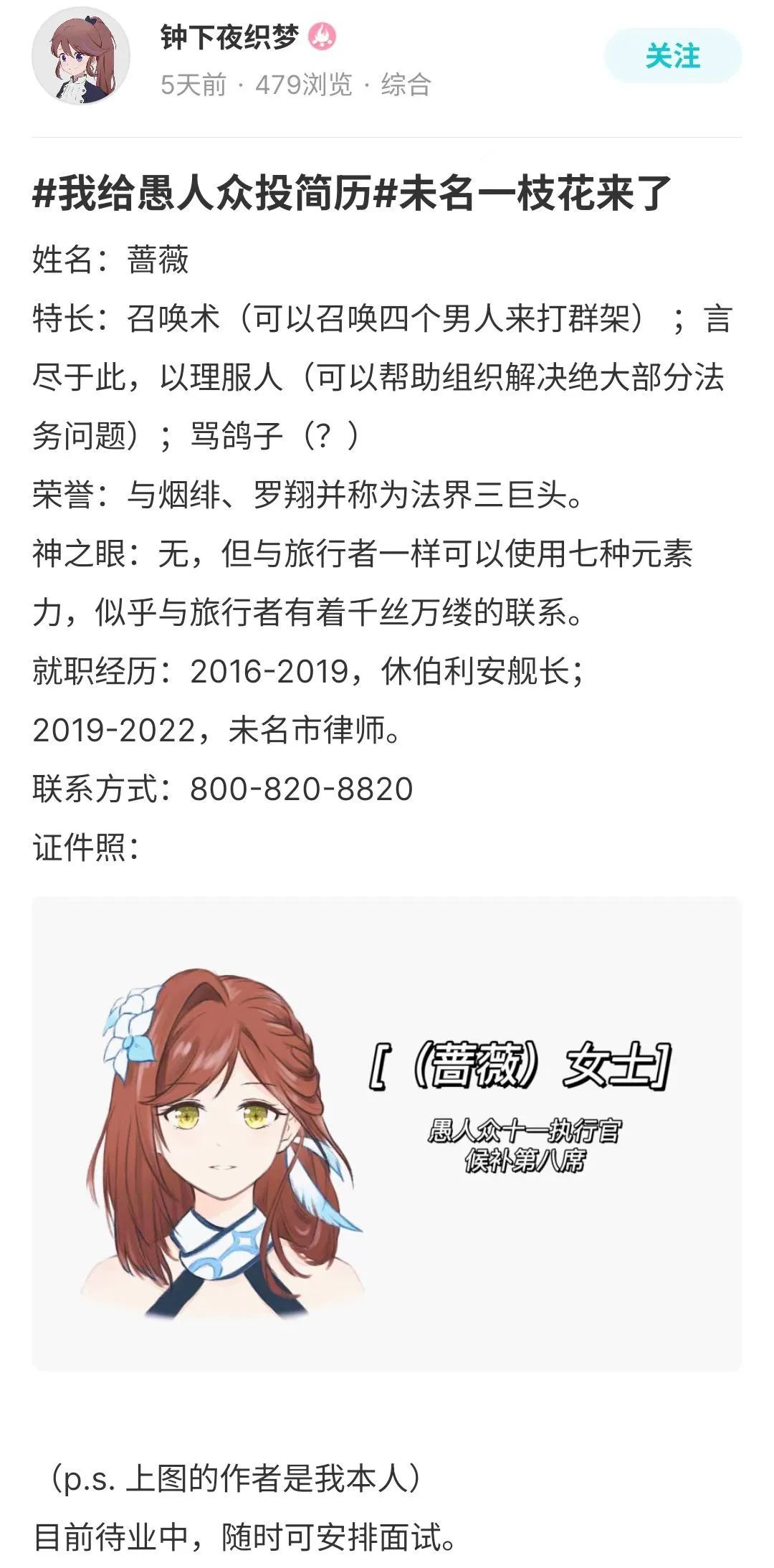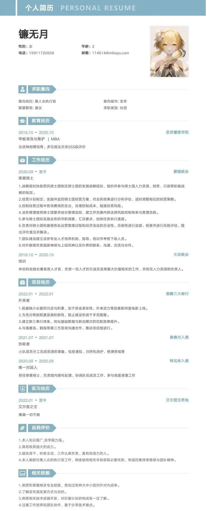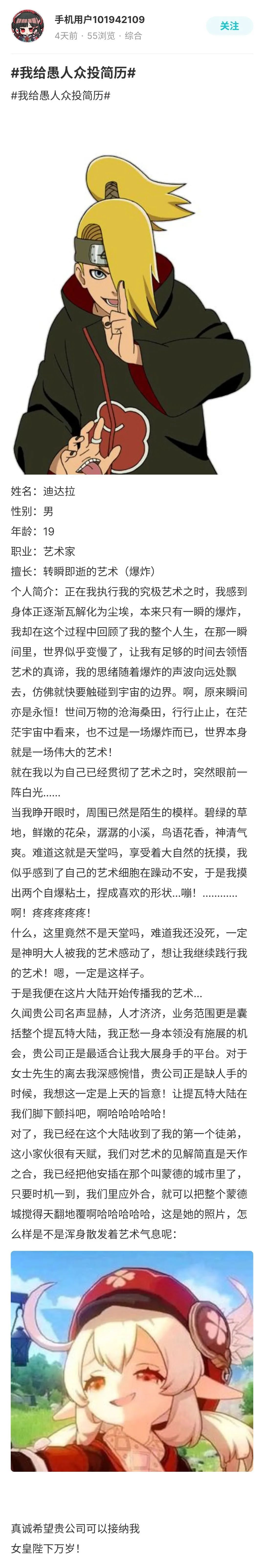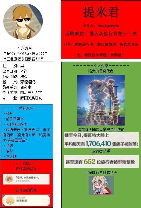 同样是简历,有靠形式取胜的,自然也有靠创意取胜的,比如这个常年被旅行者迫害的孩子终于也要加入愚人众了: