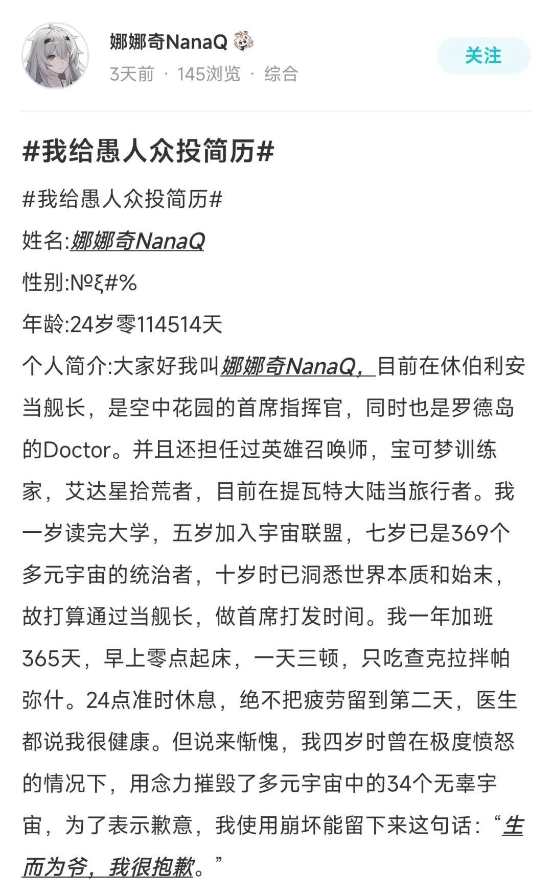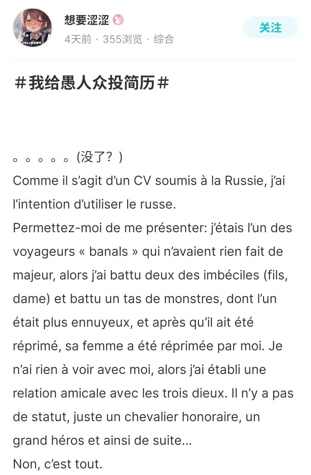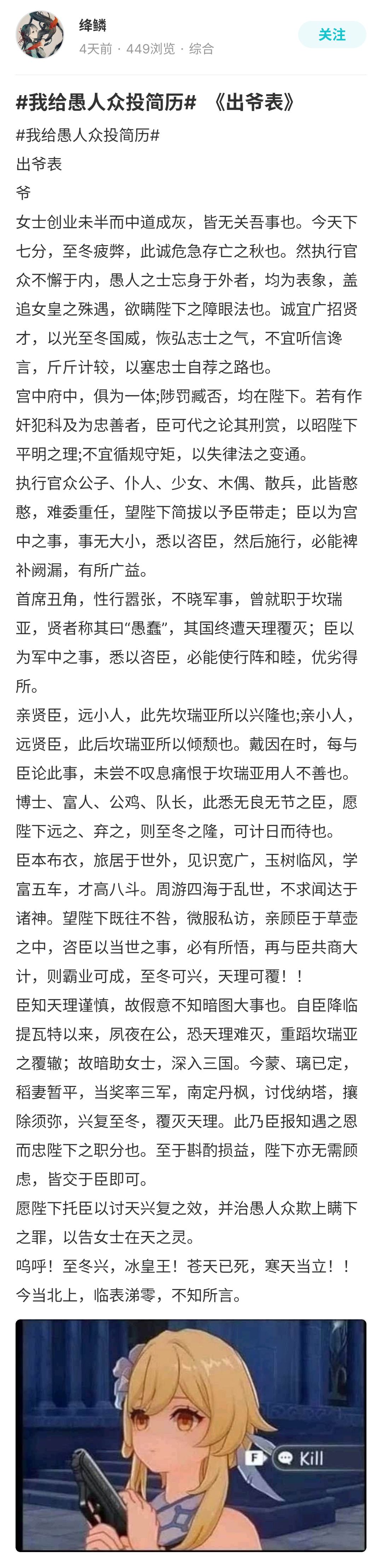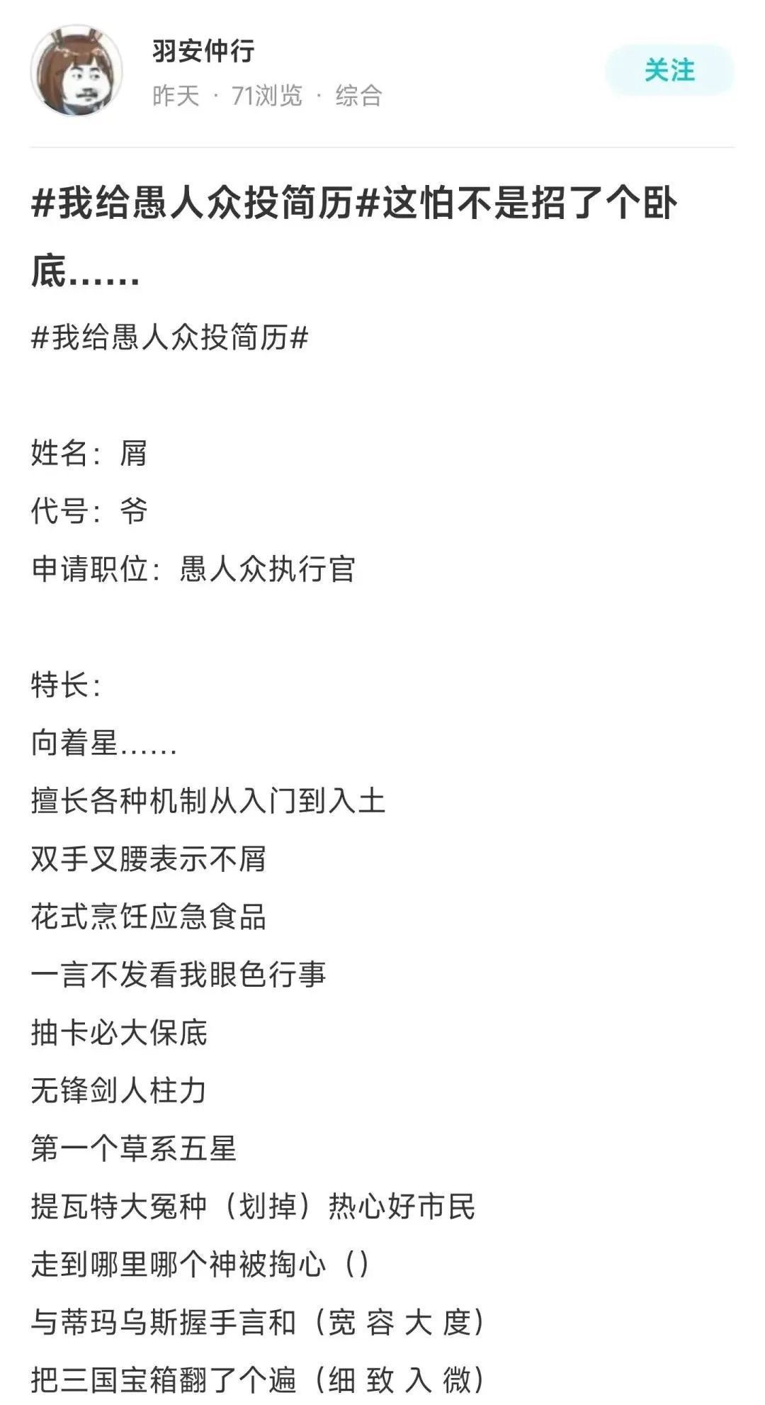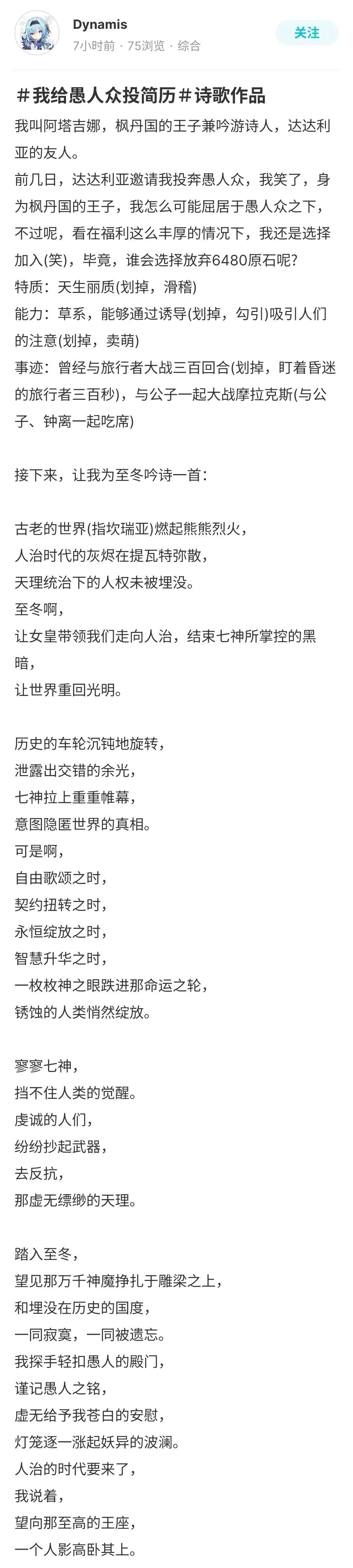 同样是简历,有靠形式取胜的,自然也有靠创意取胜的,比如这个常年被旅行者迫害的孩子终于也要加入愚人众了: