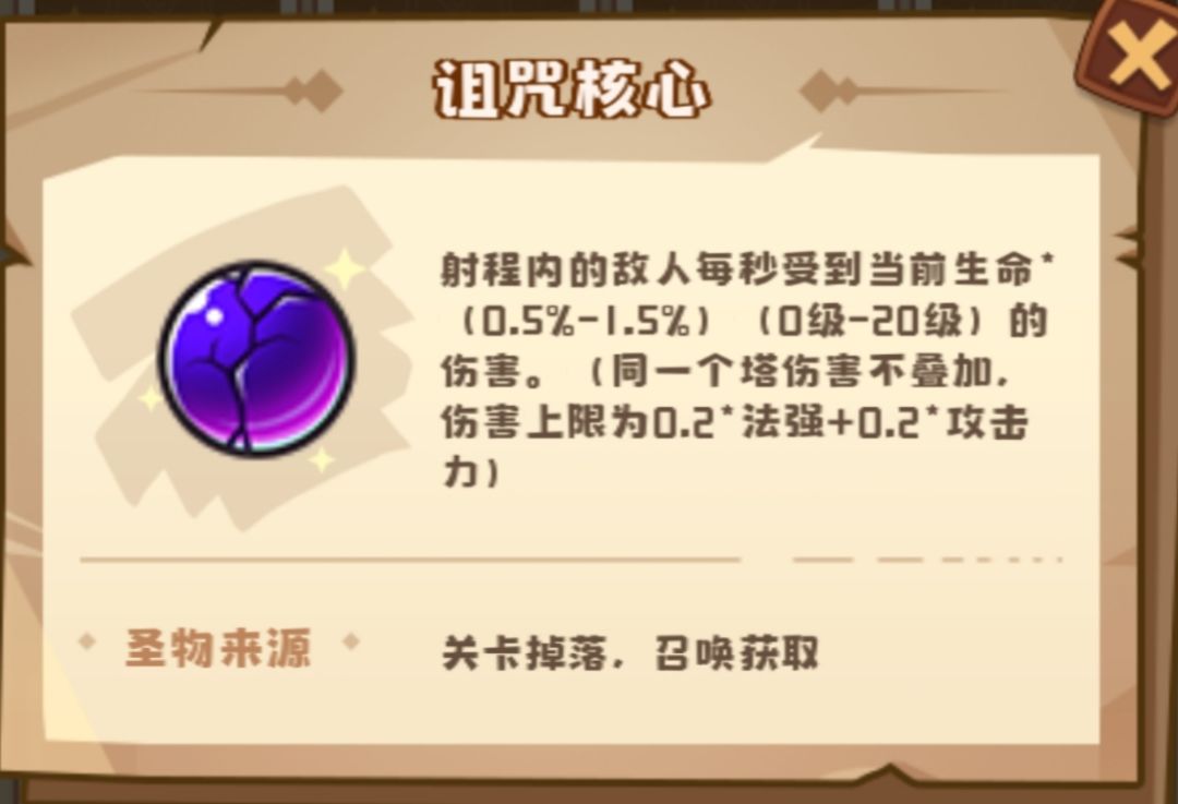 得出结论是诅咒核心这圣物的伤害,上限其实就是怪物血量的1.5%,下限是塔的(物理+魔法)攻击。