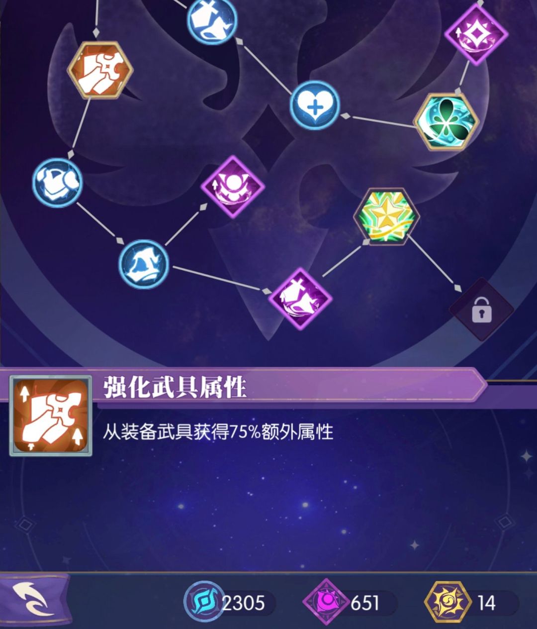 其余专武资源全部给其他英雄点出爱神前最后一个紫节点,如果所有英雄爱神都点到爱神前一个了,多余的先点圣希,点满后,重置圣希,还是点到75%武具,多余的资源给其他英雄(优先圣希底座)点到战神前最后一个节点,依次循环。
