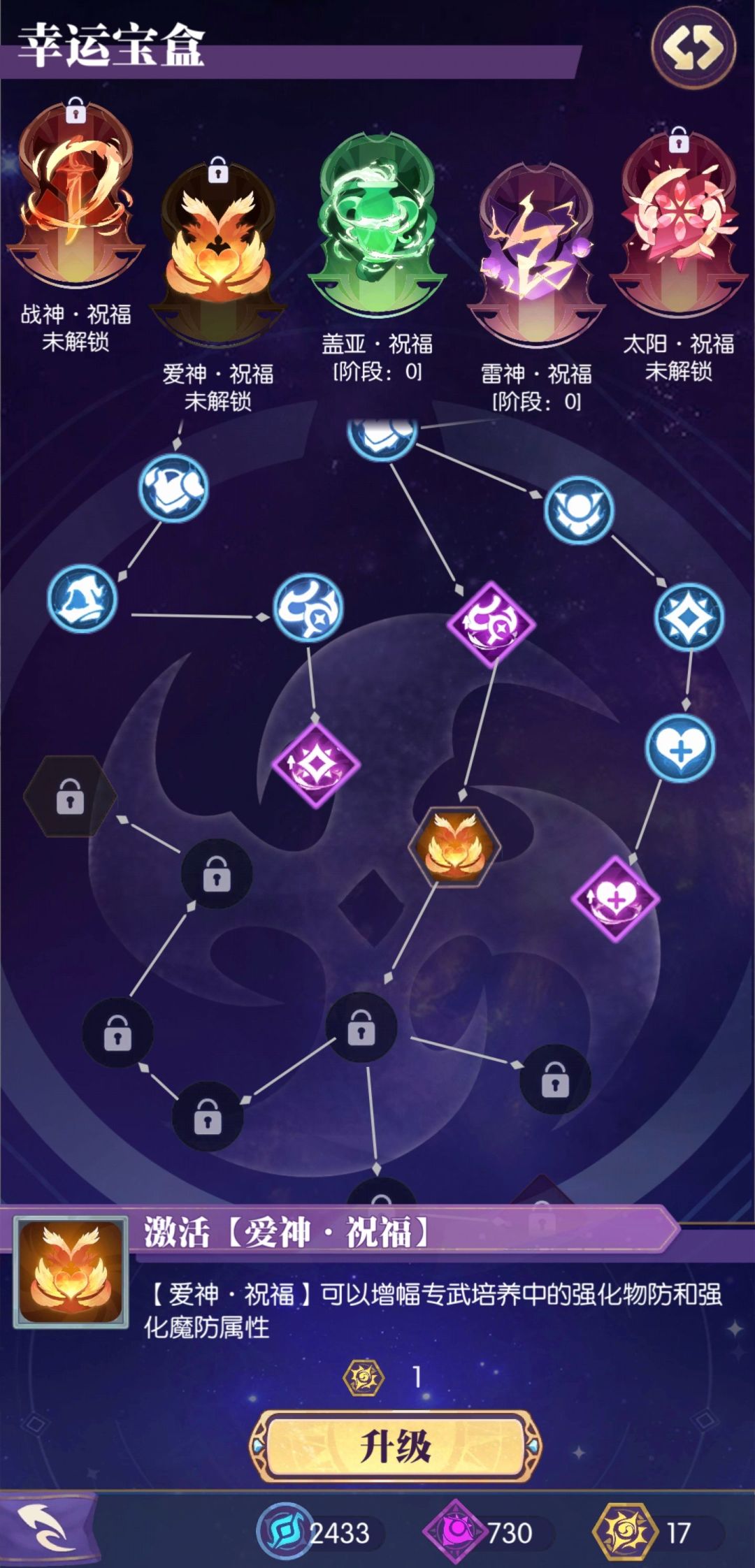 邂逅本质来说是个战力游戏,只要战力达到,自然就过了,因此,我们的一切目的,就是提升战力, 一般来说,除主C和辅助外其他英雄专武最具性价比的就是点到下一个祝福宝石前的最后一个节点,如下图,就是爱神前一个节点。