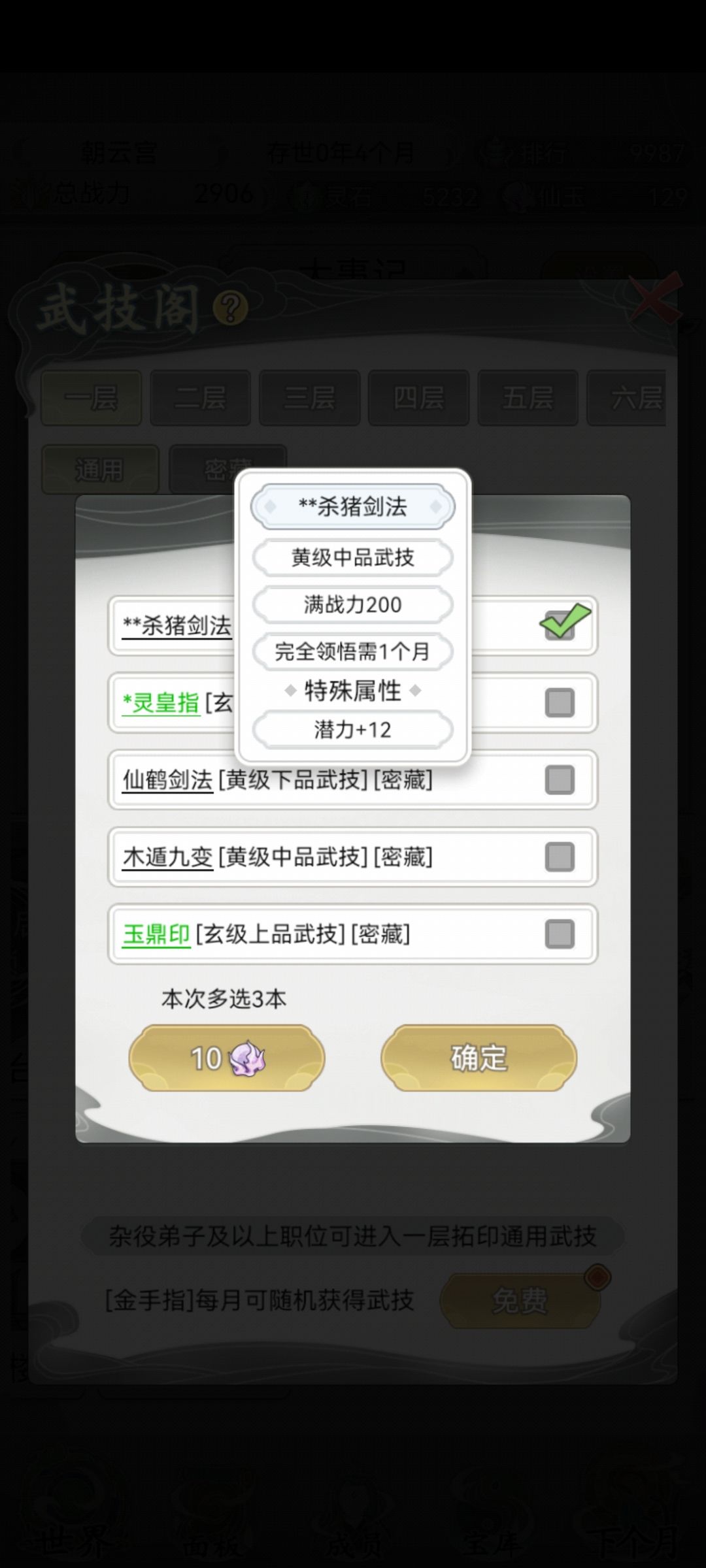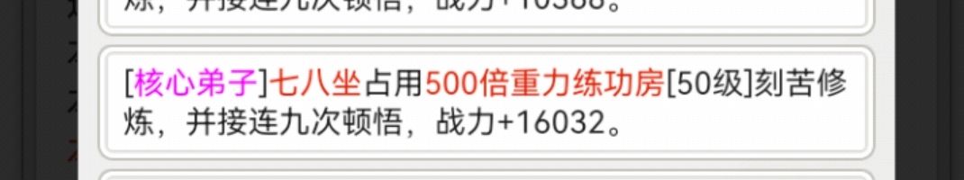 练体:首先每个弟子每个月只有一次行动力,他只能去功法楼/武技阁/练功房/炼丹/锻造/悬赏中的一种。且练功房有顿悟这一说法,我实验过一次,满级练功房满级练体一次就只能多+2000战斗力左右。