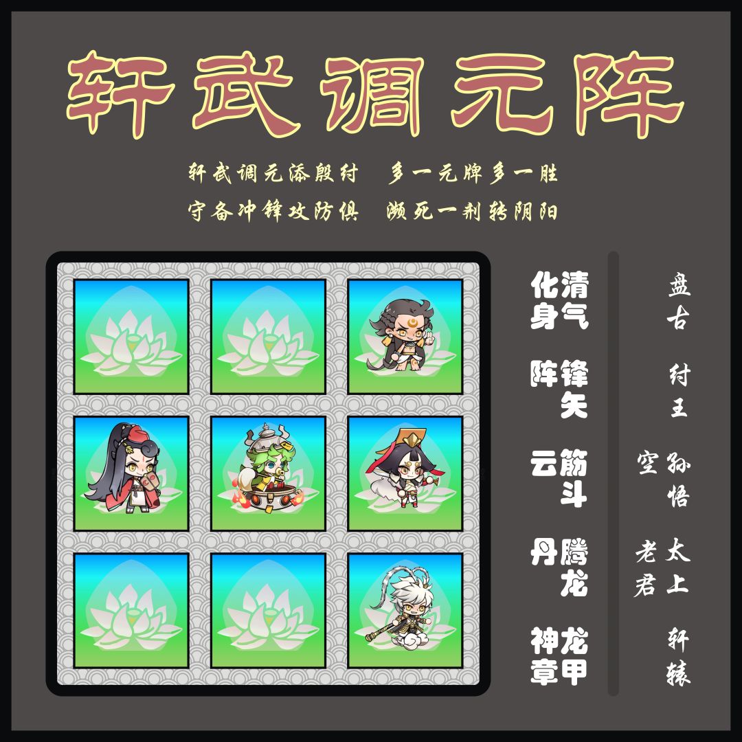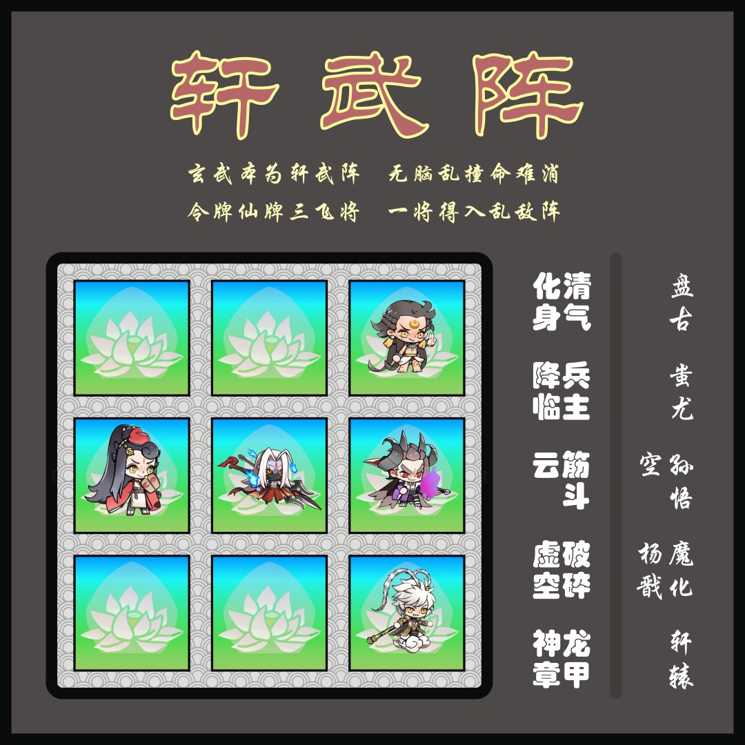 轩武阵是武阵的一个分支,武阵还有很多分支,除了上述四阵外仙人,出现较多的还有琼霄,共工等强势仙人。所以配阵时,不要定式思维,要多寻求变化,找到适合自己的方法套路。好了,轩武阵就说到这里吧,下期再见。