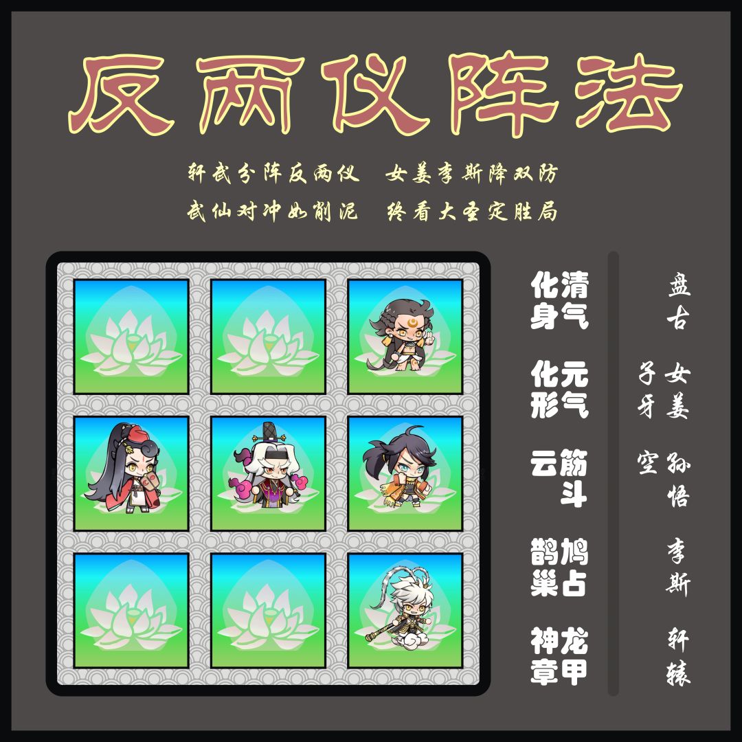 反两仪阵法是对着正两仪而做,如果说正两仪为盾,那反两仪就为矛。这里加入的是女姜与李斯,都是具备减防效果的,即便是轩武阵对冲,前排打击方面也是非常占优的。核心仍为单核的孙悟空。