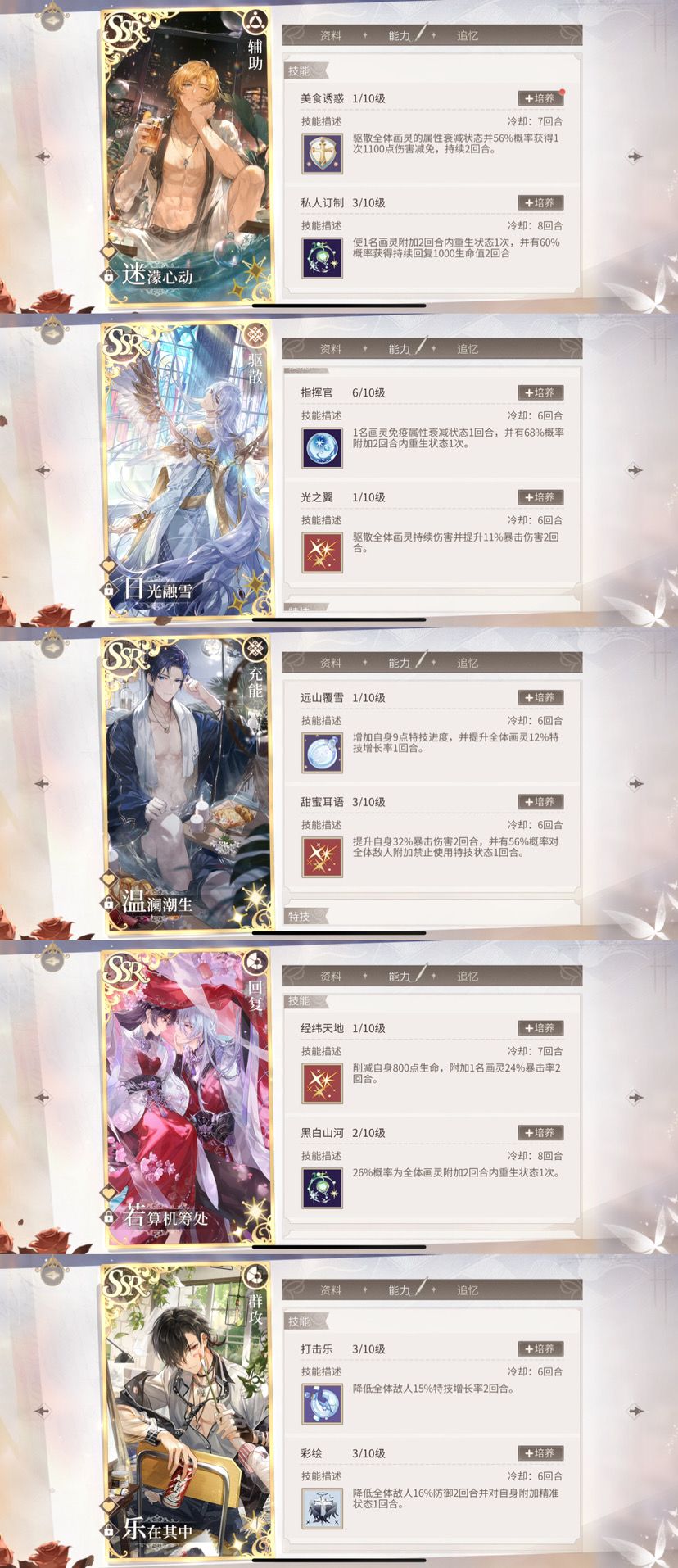 今年情人节被温泉卡骗进坑的,有没有强度大佬指点一二。觉醒喂给谁,小技能优先谁。。。(红色标记是小技能满了,蓝色是养了小技能但没满。)