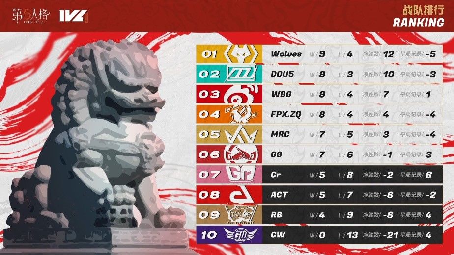 本周的比赛中,求生者方的默契配合和极限四出给观众留下深刻的印象,在前期稳定牵制的情况下,比赛中越来越多出现开门战的拉扯,十分考验监管者选手的意识,同时也展现了求生者方的配合。成都GG求生者延续上周的势头,再次起航,鏖战四场击败劲敌Wolves,又压制住了同样在回升期的Gr,关键一战稳定季后赛的席位之争的希望。Wolves发挥稳定,一次失败后迅速调整,击败MRC,基本确立季后赛胜者组的位置。