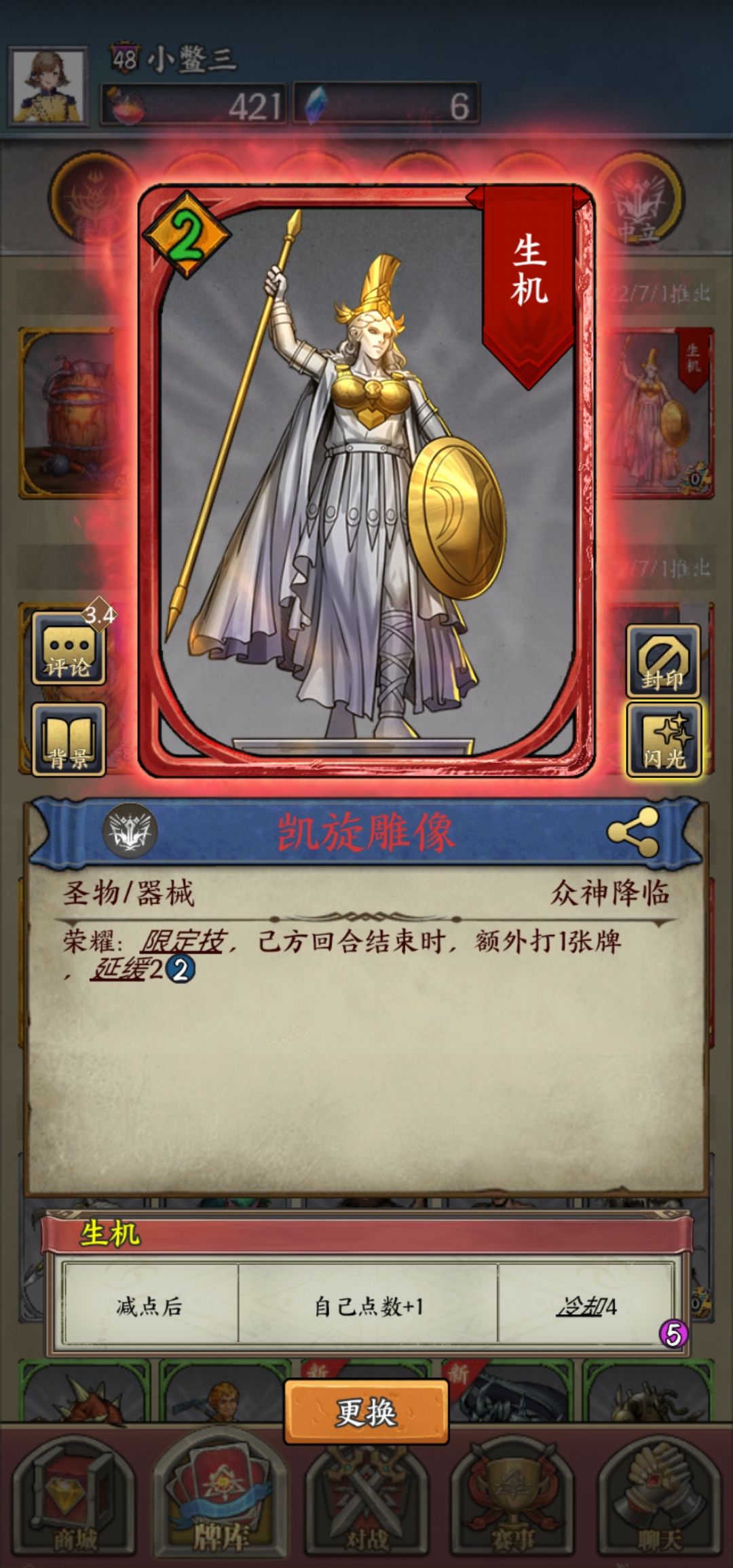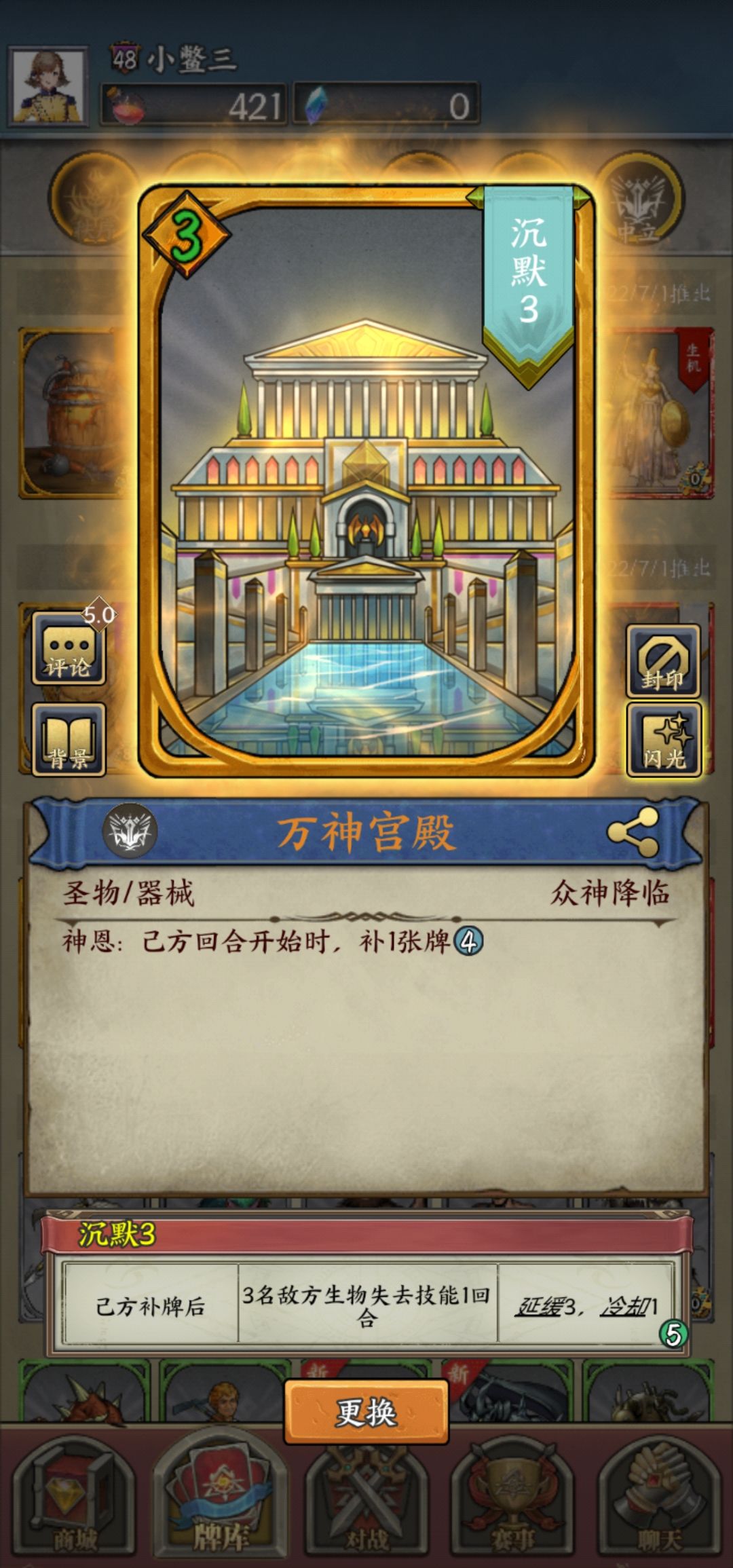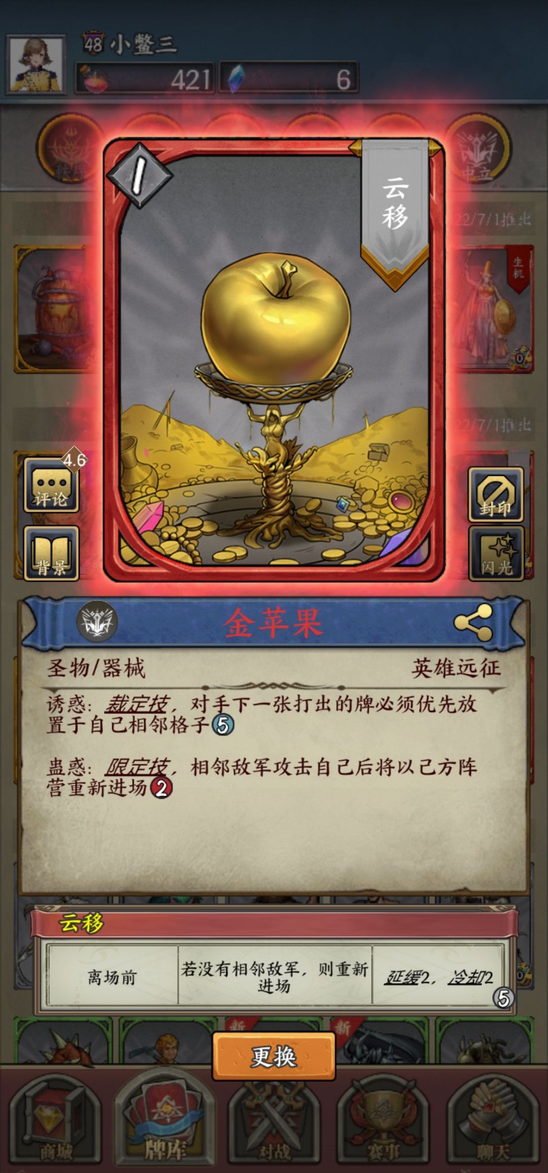 这个才是王牌,打不掉的苹果,这个附魔我愿称之为最强,闪光材料不够了,两血后,只怕驱逐。无限占场,嘲讽,翻面为一体。想不到比这个更好的附魔了,先手下这个估计也只怕蘑菇铺场了。与雕像互为一二手卡牌,建立主动权。