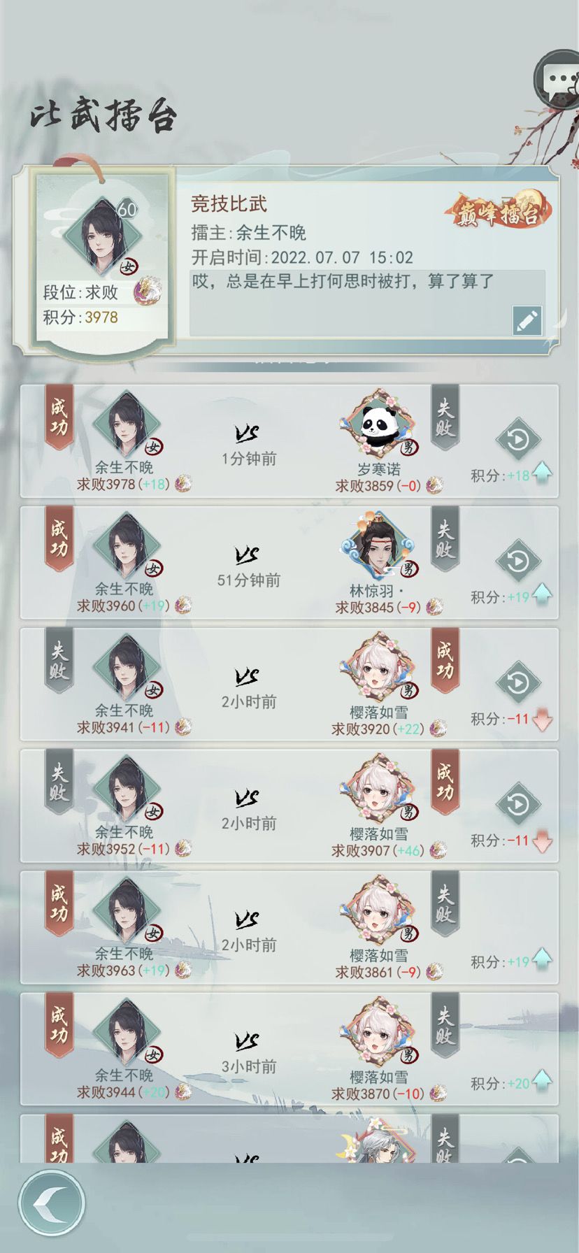 因为我的结缘的确是有些低了,武学也只有11豆。氪的一点牌子目前也没有酒菜加速,所以目前段位我这种结缘已经算是很拉的一档了。