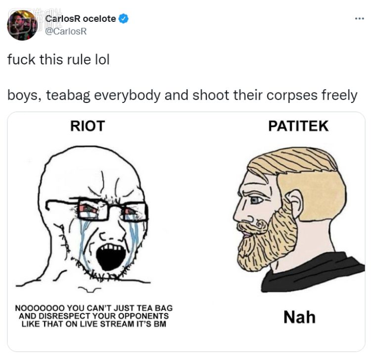 类似的先例不少见——去年拳头的《VALORANT》冠军赛上,官方要求选手们不要在游戏中对对手的“尸体”进行蹲起嘲讽,也不要故意射击,尽量尊重对方。这样的要求当然很好理解,很多玩家也表示支持。但尽管如此,也有人对此感到不太高兴。G2俱乐部老板Carlos
