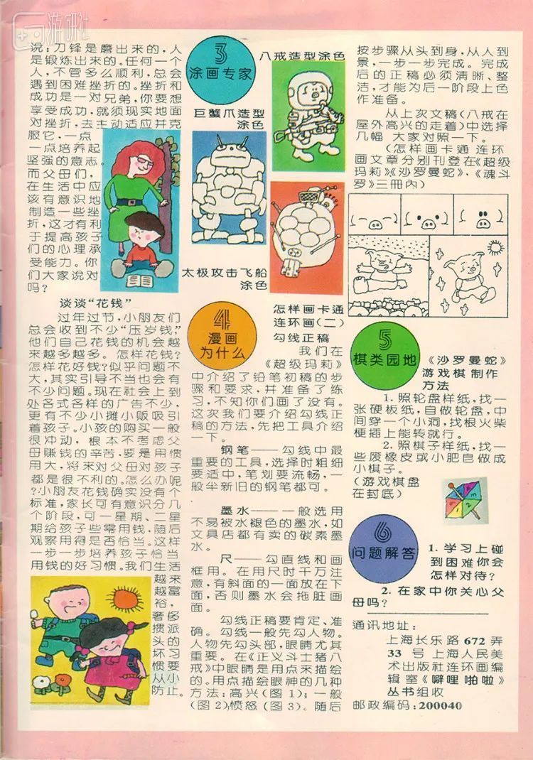 书后的两页内容类似小百科,介绍了登场角色的相关原型、家长与孩子之间的谈心,还介绍了些简单的漫画教学,可谓“寓教于乐”。书中也确实提到把自己定位成一本“集故事、游戏、讲座、谈心于一体的新型多功能卡通画册”。从红白机老四强的角度上说,五本书的游戏就占了老四强中三个指标,也算是“押题精准”。