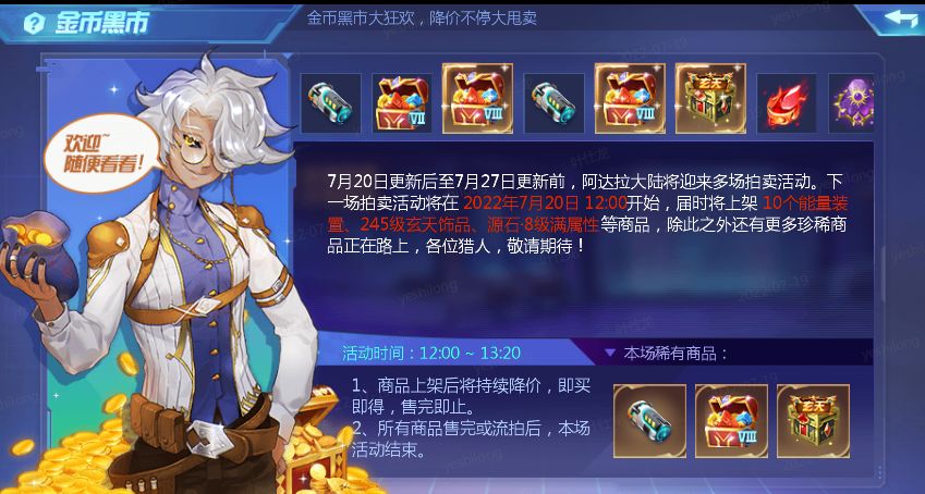 黑市商人带着新一批珍稀物品来到阿达拉大陆,245级玄天饰品、245级流浪装备、能量装置、幽冥之息、源石•8级满属性、源能组件、不朽宝石碎片等豪华奖励邀你抢购!