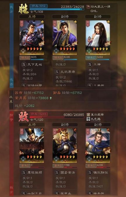遇到低配的“太尉盾”,吕布的爆头伤害配合郭嘉高属性打出的火炽原燎,直接两发打了11446的伤害,藤甲兵瞬间被融化!反观三势吕这边的战损不到2000。
