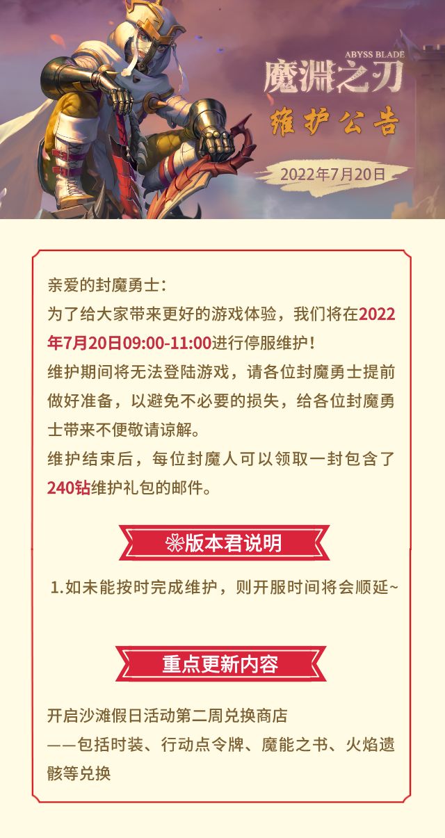 明天(7月20日)上午9点至11点 魔渊将迎来日常维护