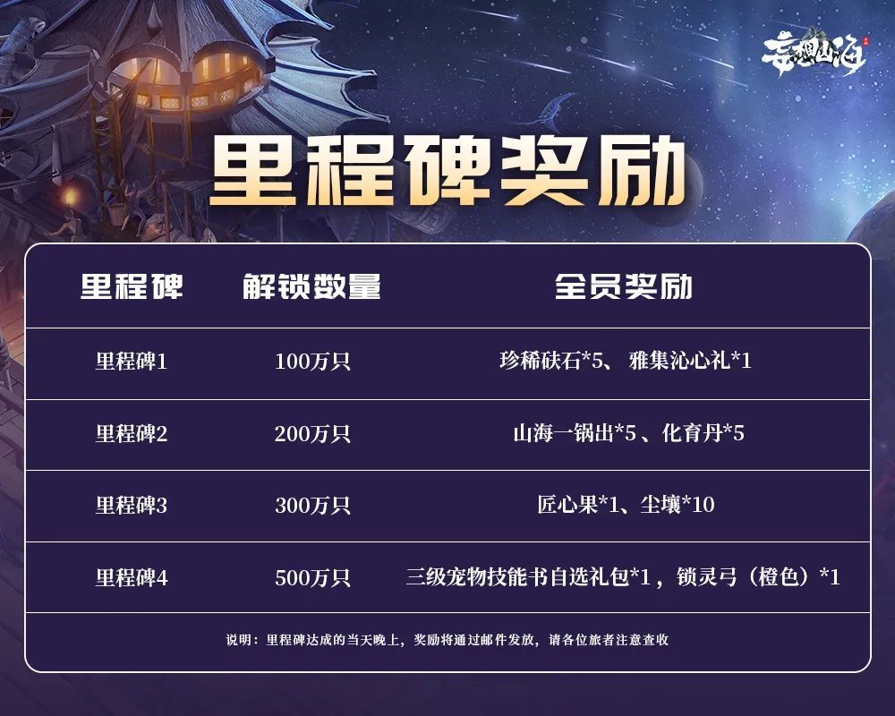 为了答谢各位旅者,十巫众人按照约定已经将对应的里程碑奖励以邮件形式发放!具体奖励内容如下图所示: