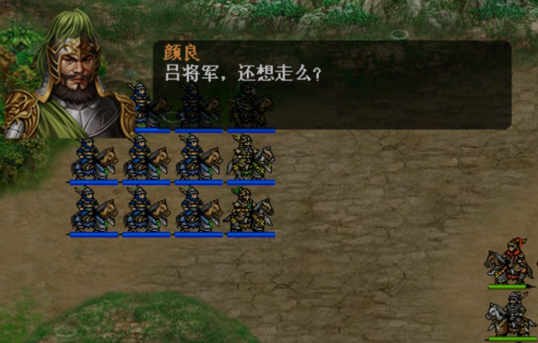 事件4:我方到达(13,y)坐标或第15回合时,敌方回合颜良文丑高干率领9重骑兵在荒地后面出现。