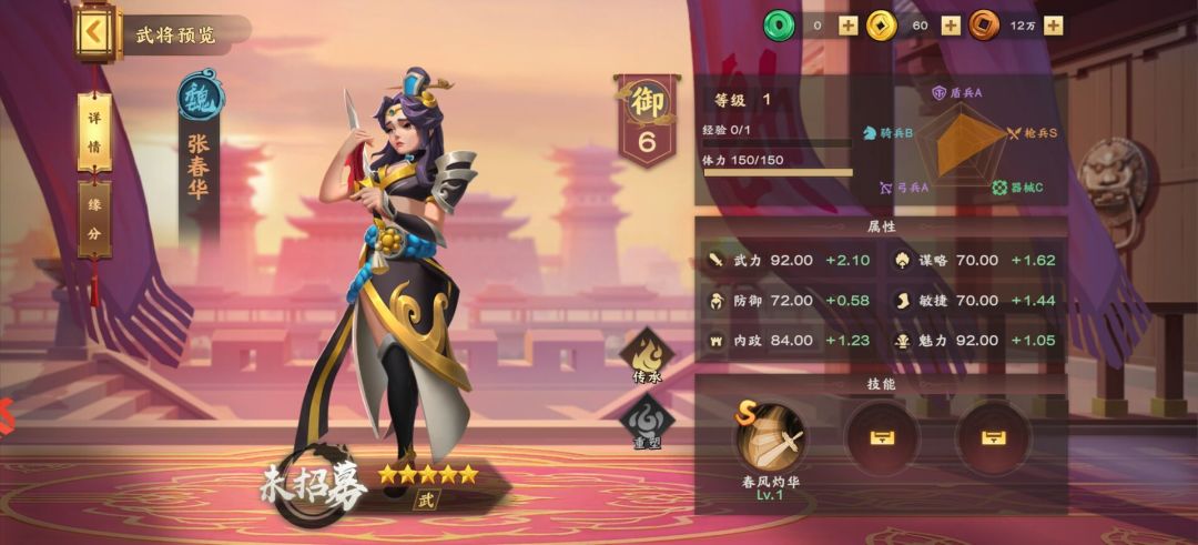 在《胡莱三国4》中,张春华的角色设定是以武力见长,技能【春风灼华】满级后,可提高自身30%的暴击率,最大叠加2次,持续2回合,在下一回合行动前对敌方兵力最少单位进行一次高达196%的武力伤害,虽然是单体伤害,但是杀伤力巨大啊!