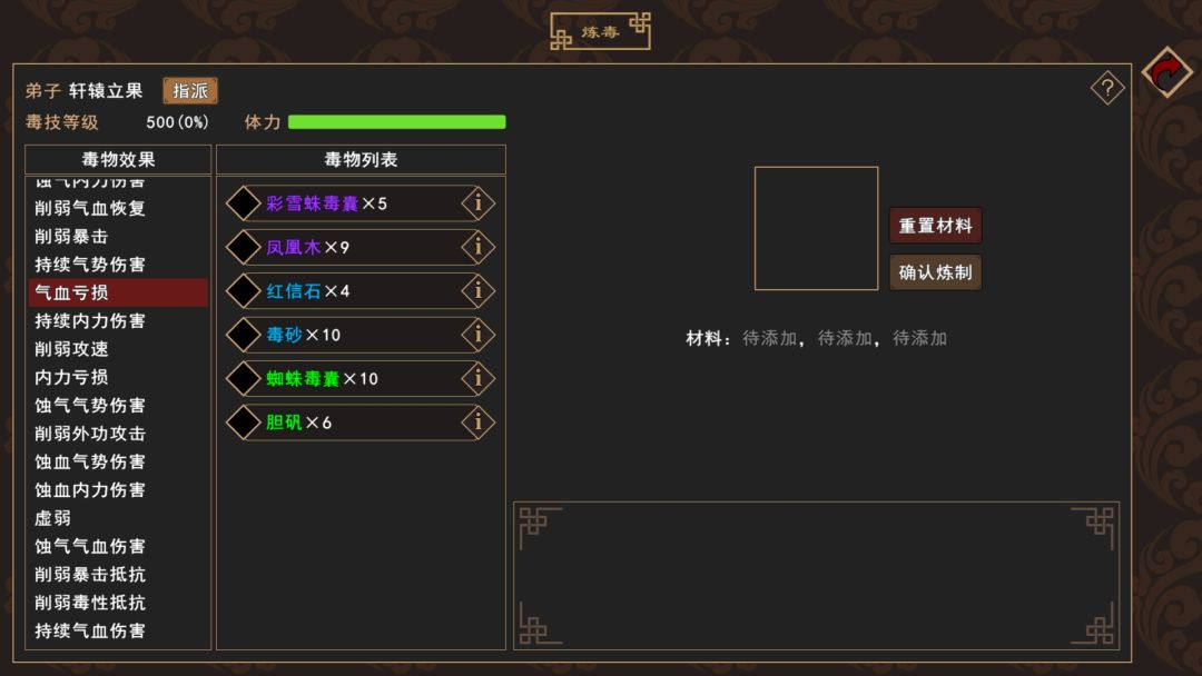 划重点:所有同一个框架内的物品都可以组合做毒药,同一个框架内不同的物品组合会有不同的强度,强度还受限于基础毒等级