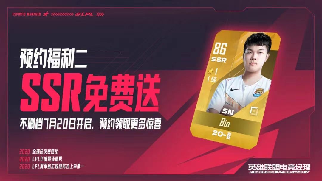 选手是组成战队的基础,相信各位经理人已经跃跃欲试,《英雄联盟电竞经理》也贴心送上满满的福利。此前已预约游戏的经理人,开服登录即可领取免费SSR- Bin,更有30连抽福利助力你招募心仪选手。