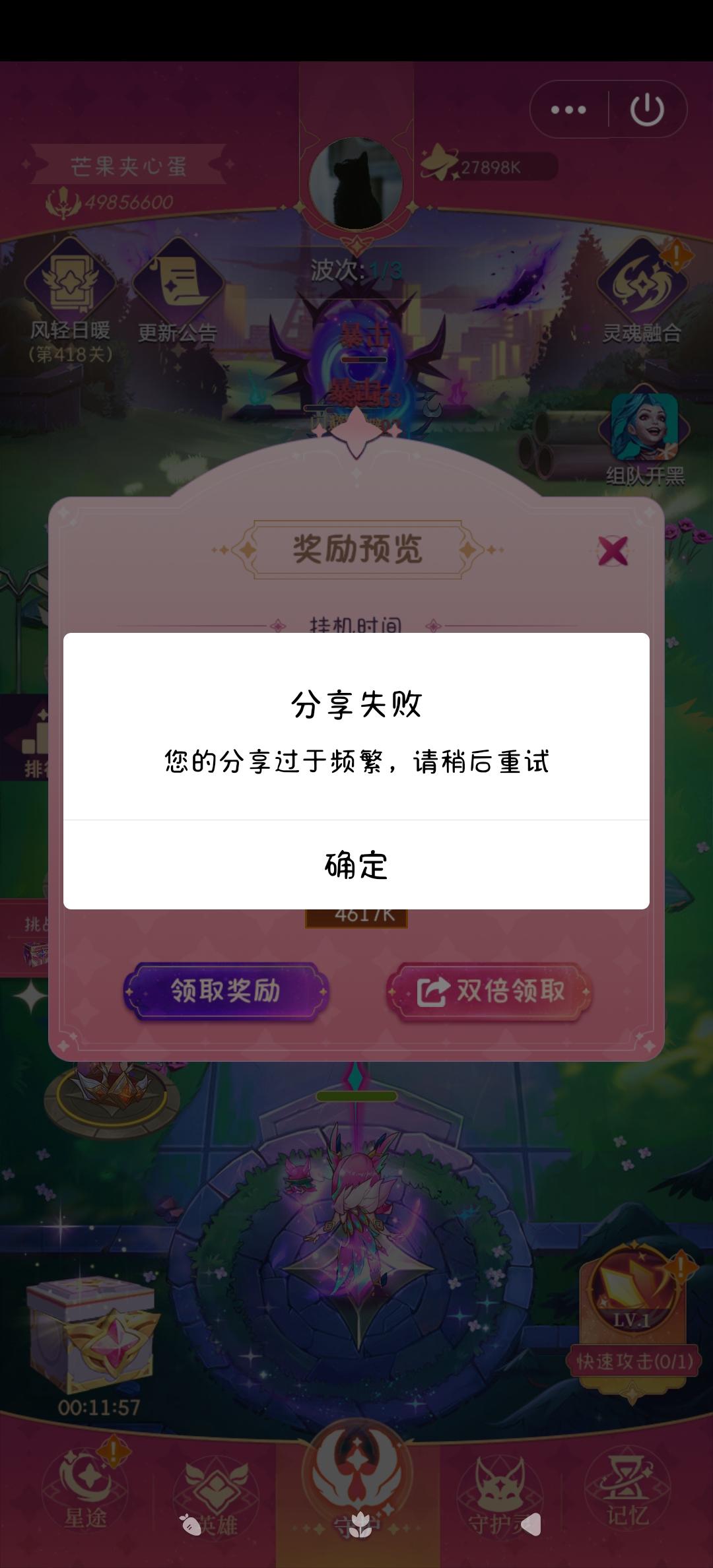 和大家说一下这个小游戏,不清楚有多少人是为了表情去的,但是表情获得要3000+,一天只能开200箱子前提还是要获得,这个时候就很需要双倍领取了,前几十次双倍领取可以选择分享然后选择QQ跳到QQ再切回来,直接算成已经分享,后面分享多了就会显示分享过于频繁,我开始以为过于频繁就没法继续双倍了,后来意外发现出现这种情况,只需要你把游戏切后台再回来,依然可以双倍领取!所以分享一哈希望大家都能早日拿到表情
