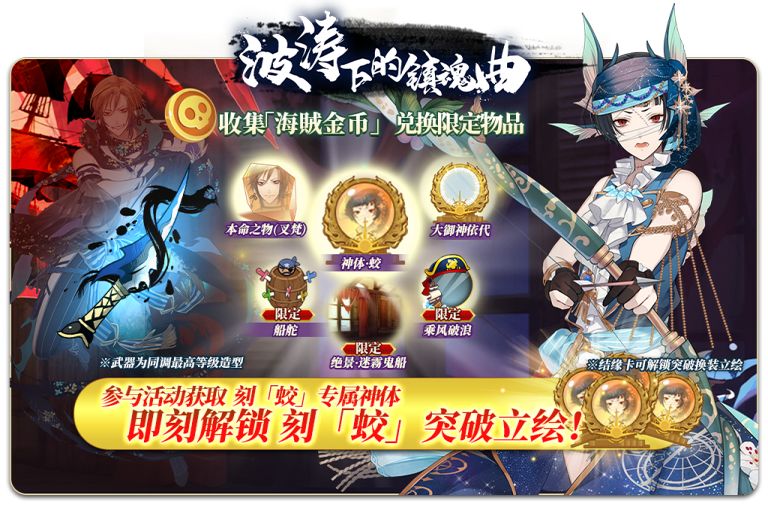 在本期活动中,在活动商店中可使用收集来的[海贼金币]兑换本命之物(叉梵)、神体·蛟、活动头像框、活动御殿背景等限定奖励!