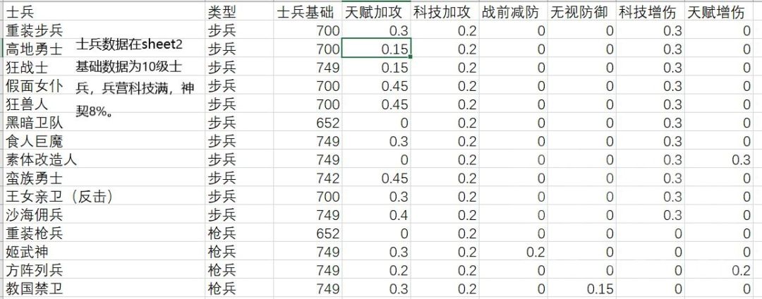 sheet2有士兵的数据,因为是我自己的数据,所以兵营科技满,神契加成是8%,总计按照88%攻击计算。士兵基础攻击和士兵的天赋科技可以根据自己的情况修正。