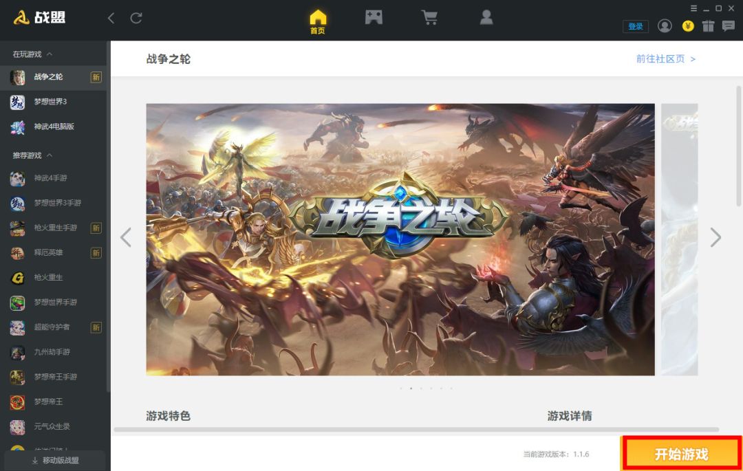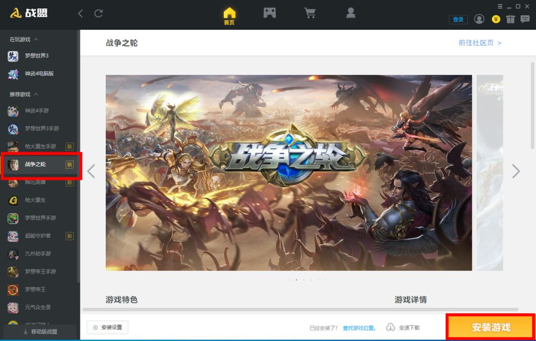 1、打开多益战盟,侧边栏点击“战争之轮”,再点击右下角“安装游戏”