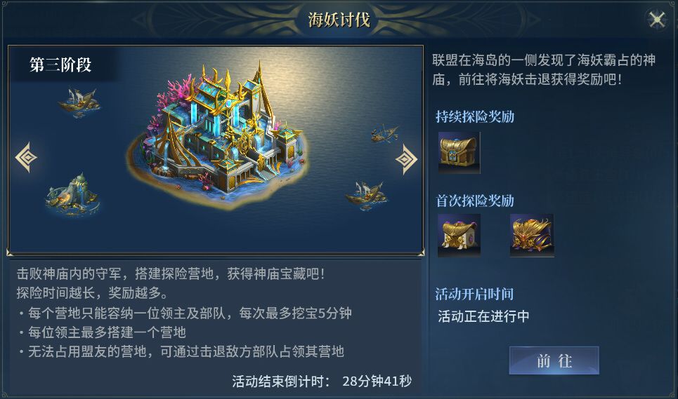 海妖一族常年栖息在海岛的东侧,霸占着水之神庙,各位领主可利用联盟要塞驾驶战船,讨伐海妖,并挑战海妖女王。同时还可以探索水之神庙,寻找海妖秘宝的线索。