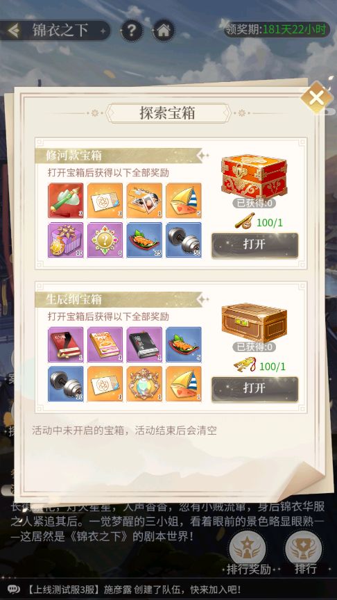2、三小姐可在活动期间消耗对应的锁匙开启宝箱获得奖励。