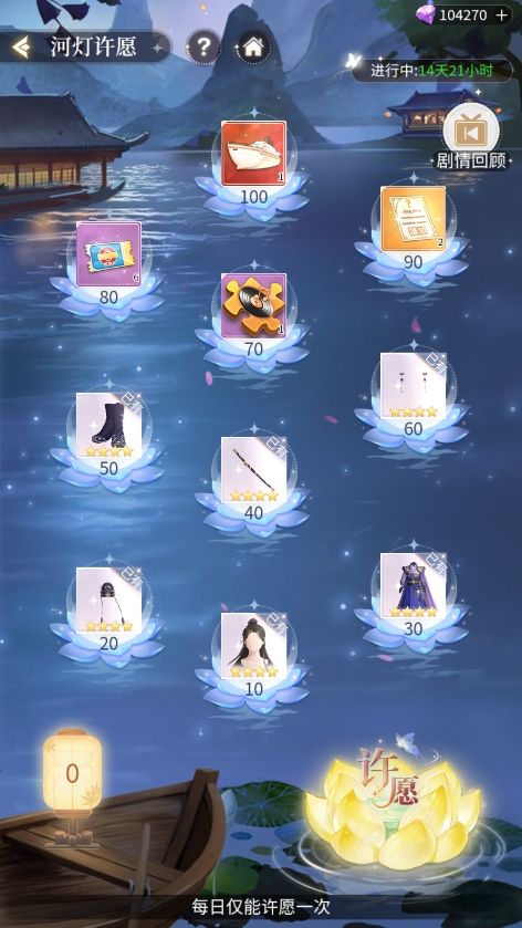 各位三小姐可前往河畔流放花灯许下自己的愿望,每日许愿均可触发专属剧情,累计许愿10天以后还可领取锦衣之下限定联名服饰。