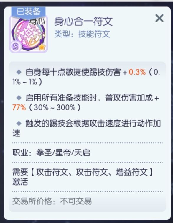 四个踢技下面这个勾选上后,可以获得身心合一符文的普攻伤害加成,最高300%,这可以在乎,毕竟会打很多普攻,也可以不在乎,所以…看自己情况抉择。