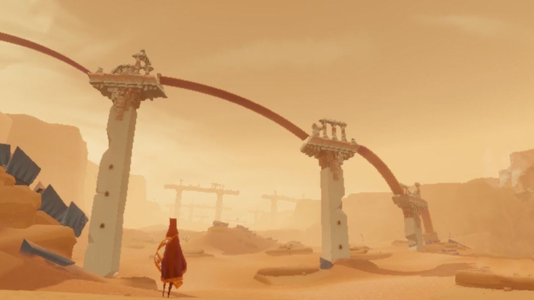 在茫茫的沙漠之中,无名旅者孤独地行走着。突然间,他与另一位旅人相遇了。他们从陌生变得熟悉,互相传递能量,在偌大的世界一同携手前进,直至生命的尽头。没有标签、不再孤独,这是陈星汉通过《风之旅人》想传递给大家的情感。