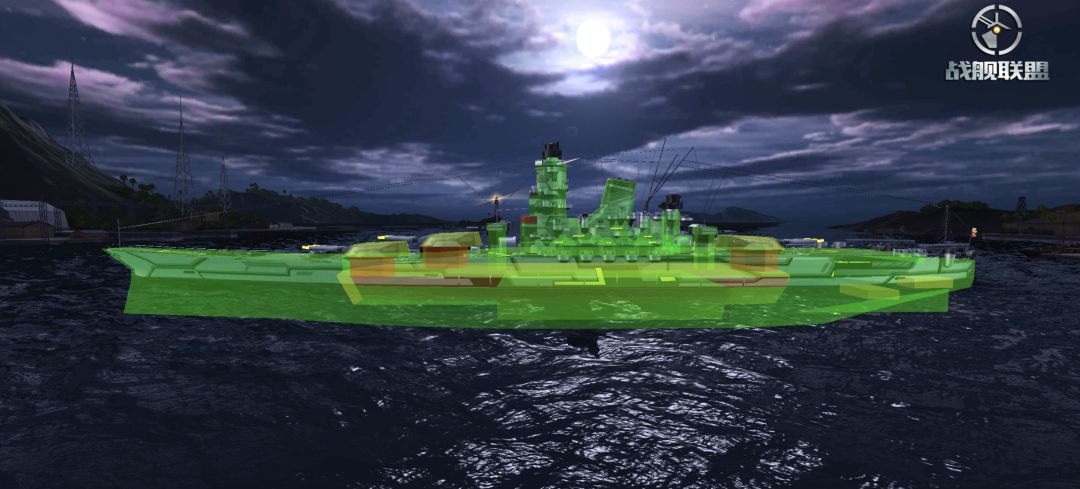 她的舰体侧面装甲为红色(为什么绿完了我也不知道哈哈哈哈),这里的铁板厚度非常厚,(请你利用击穿机制回答,为什么不能击穿,写在评论区)如果炮弹命中的角度小于当前炮弹的特殊跳弹角,就会跳弹,无法造成伤害(不严谨)。你游没有装甲厚度指示器,也没有详细的特殊跳弹角数据,所以想要讲明白装甲这一概念还是挺难的。