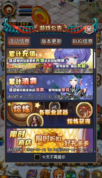 公告按钮移动至主界面,点开即可查看当前开放的活动信息、版本更新内容与BUG信息,点击相关活动图标还可以直接启动对应活动窗口,或自动寻路哦~
