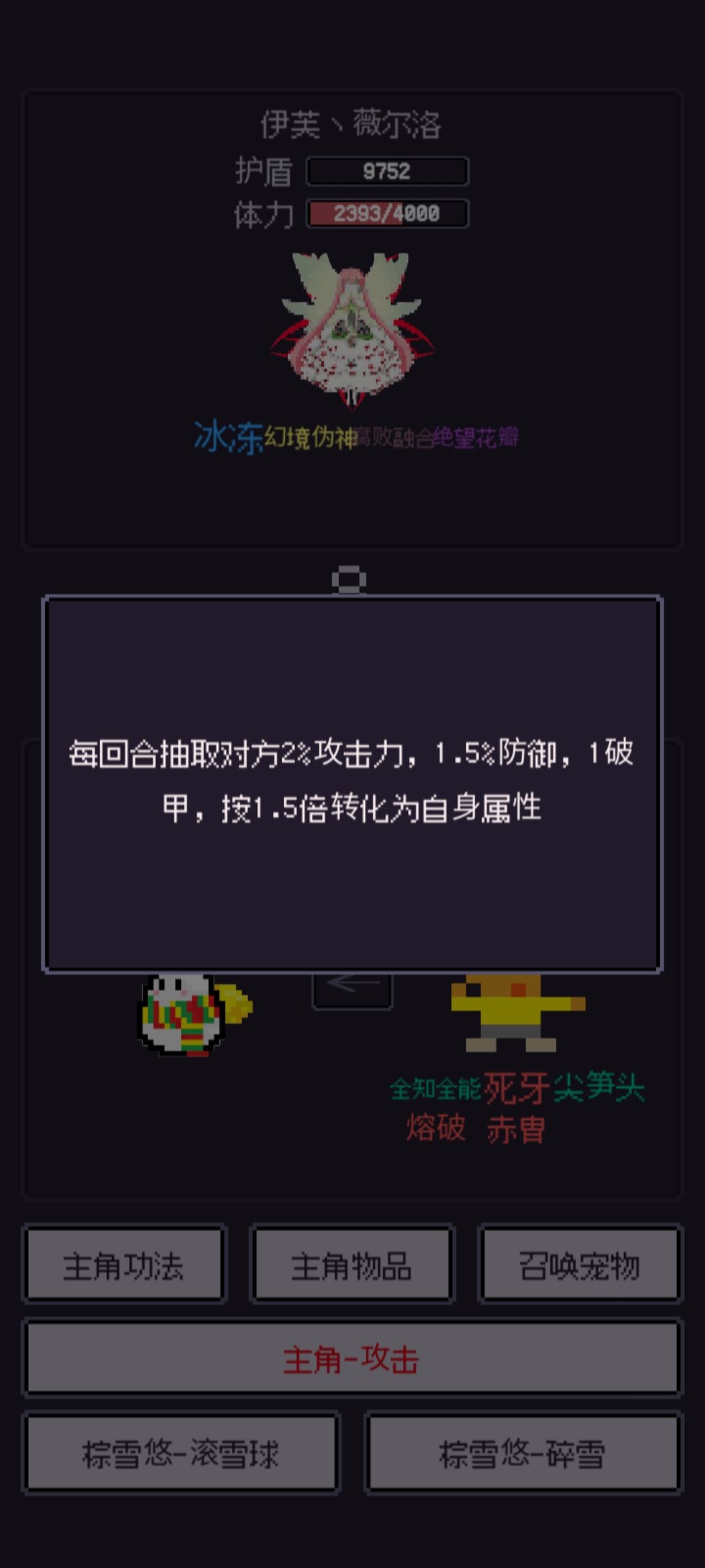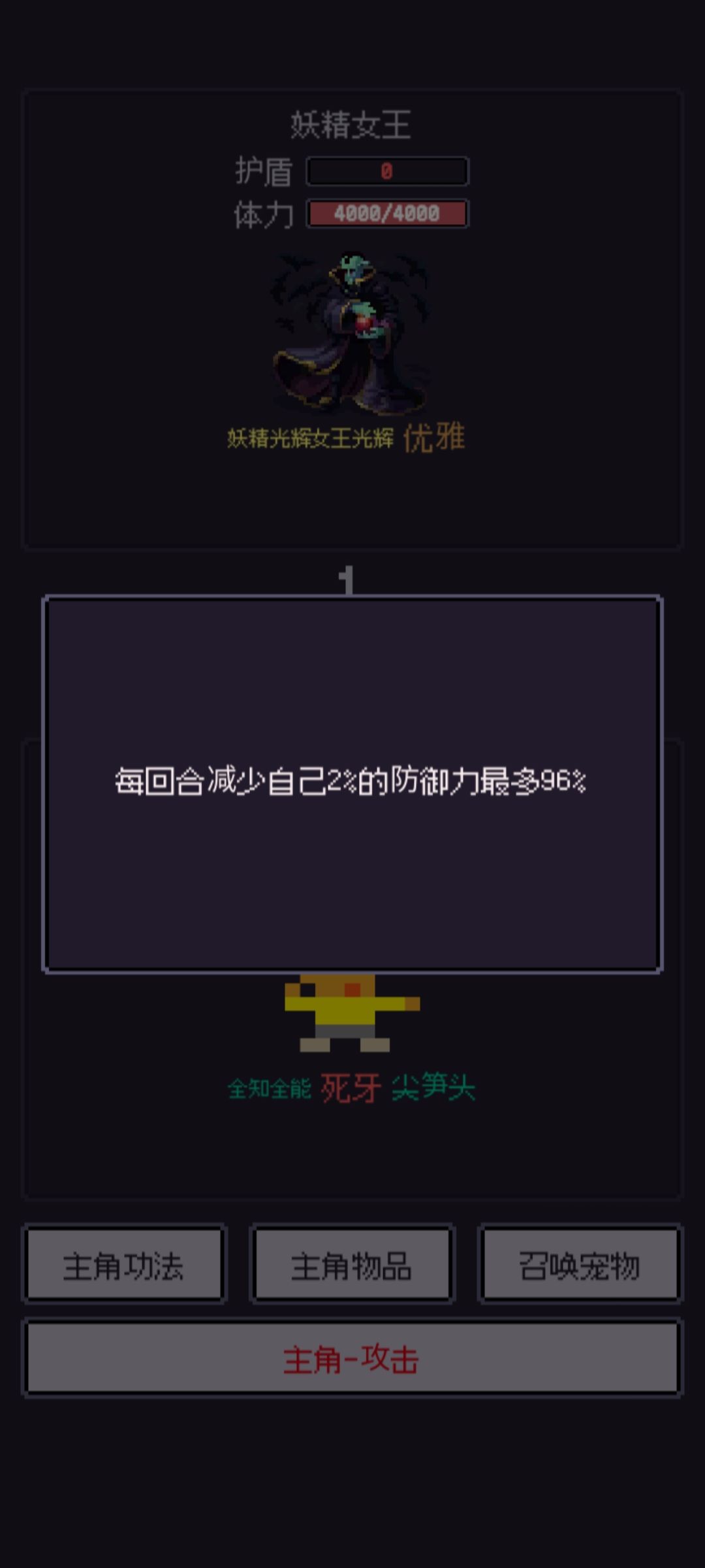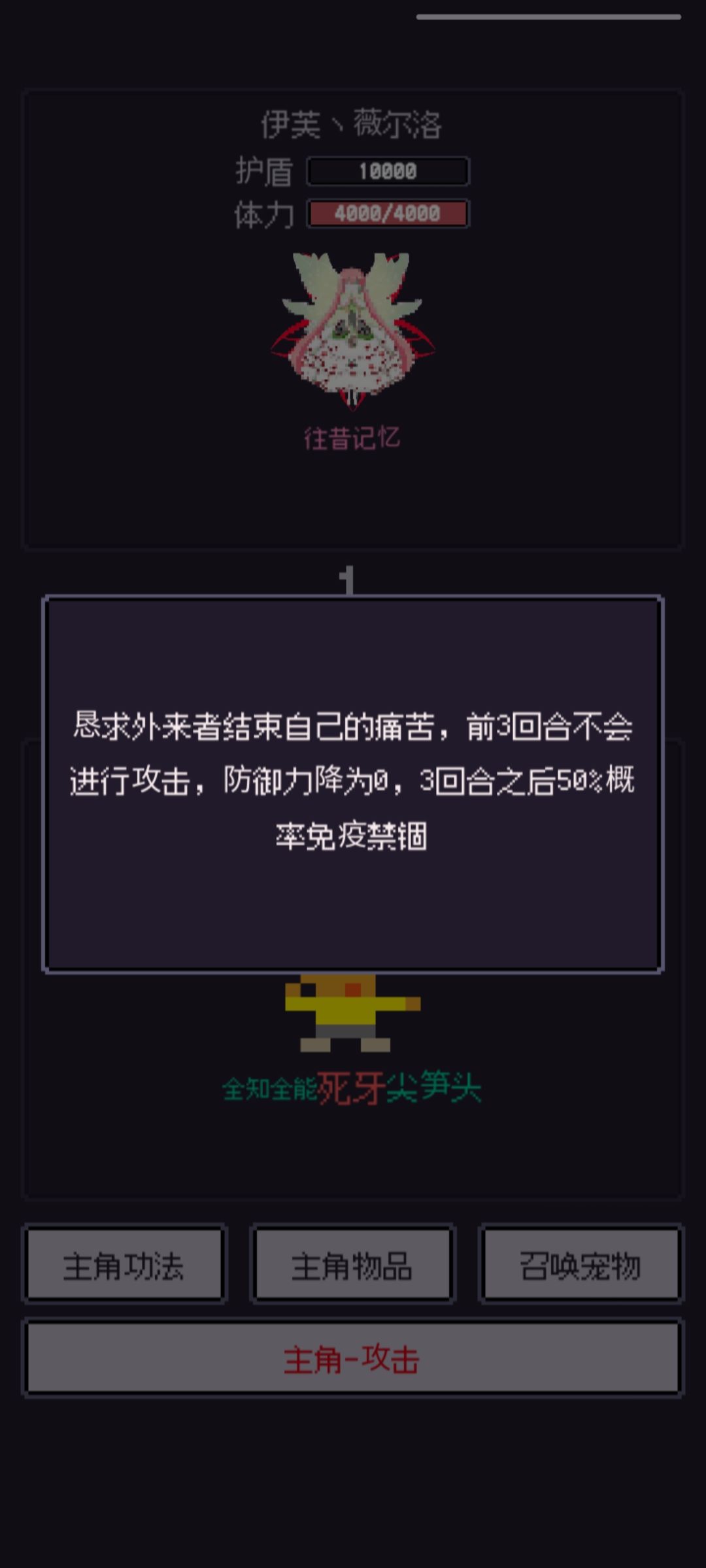 开打跟伊芙一样宠物抗,死了就复活,不同的是死牙变得更加重要,没有死牙很难杀掉他(啊,我不用死牙40回合才杀)接下来是它的一些技能,不用死牙很难杀所以也没什么可讲的点火球你甚至都不用放