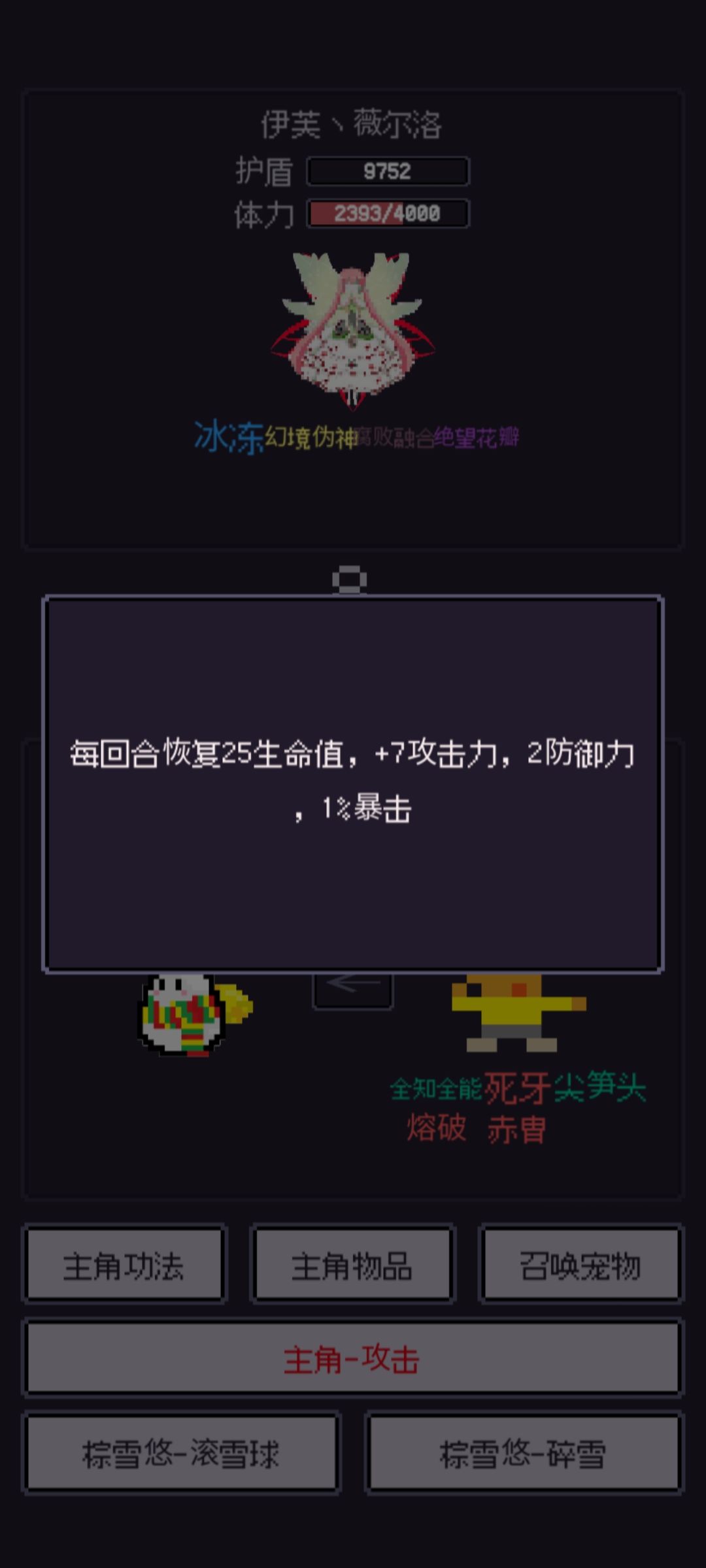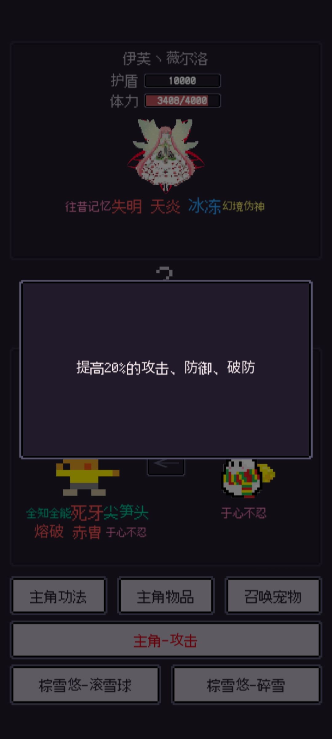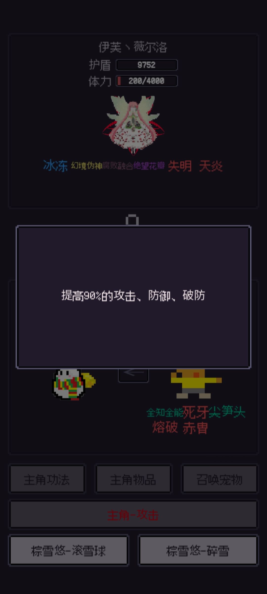 开打跟伊芙一样宠物抗,死了就复活,不同的是死牙变得更加重要,没有死牙很难杀掉他(啊,我不用死牙40回合才杀)接下来是它的一些技能,不用死牙很难杀所以也没什么可讲的点火球你甚至都不用放