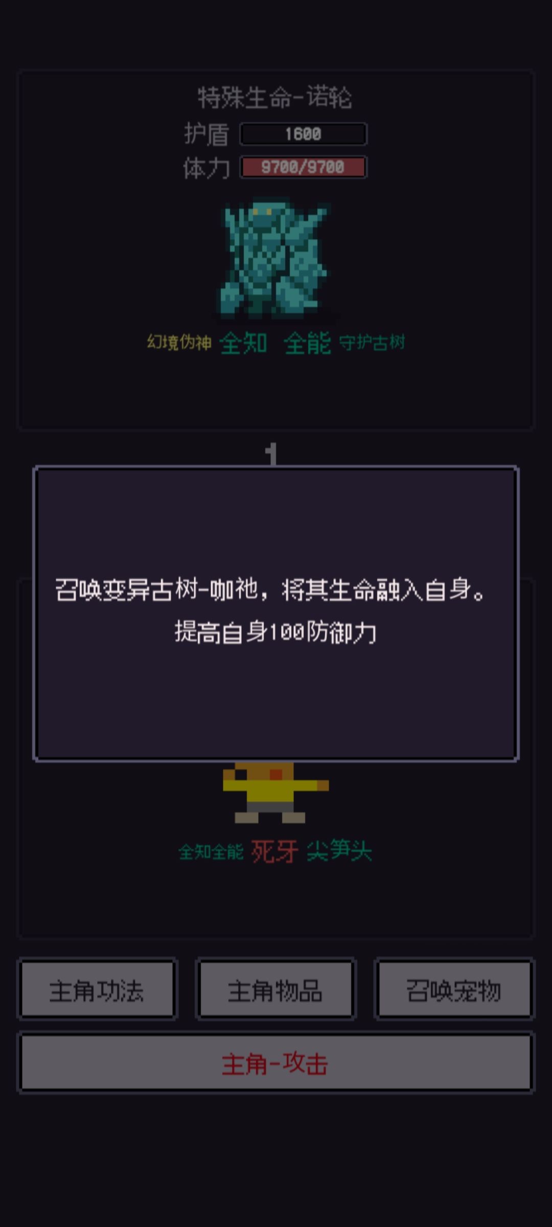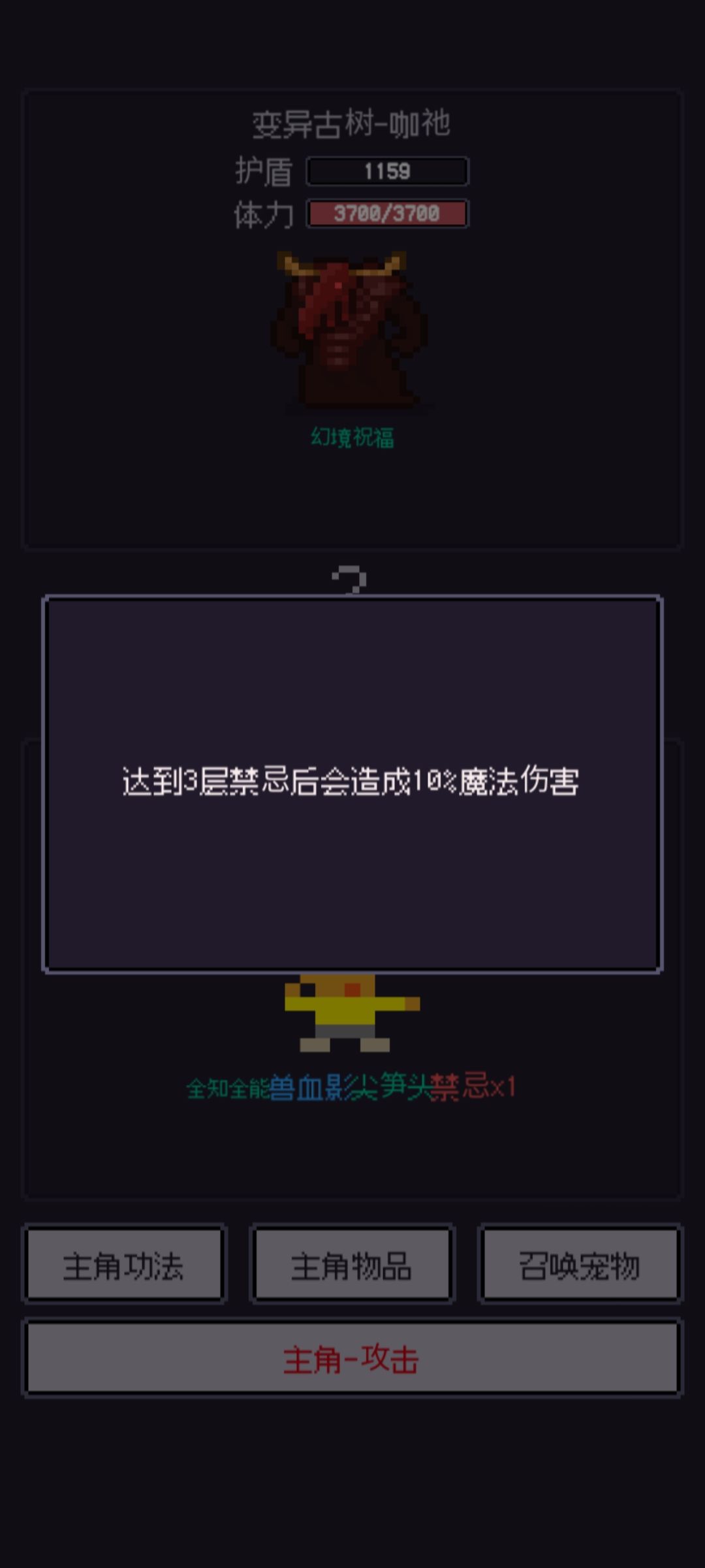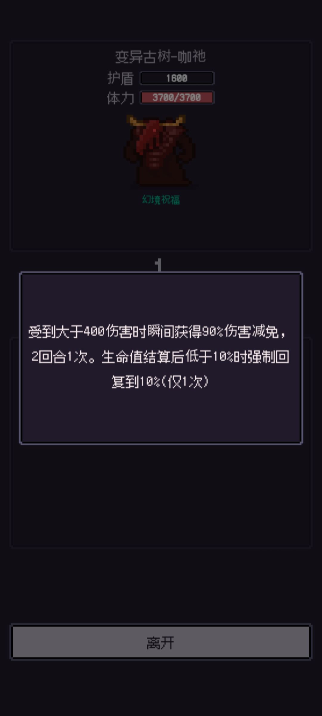 3.这个相当牛啦,变异古树-咖衪:打一下如果先手就是1000多,所以我刷的时候都是存档刷,后手直接死,先手也没什么好说的了直接禁锢到死,而且这个时候可以不破防就需要武器在铁匠铺赋离子切割,就算不破防也打的动