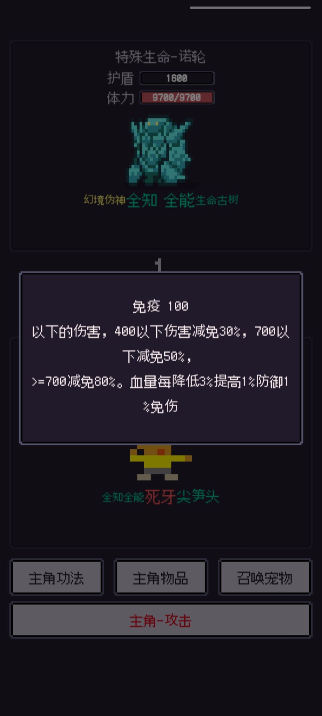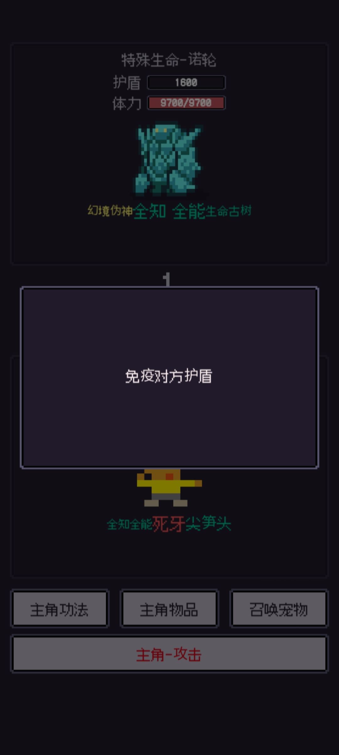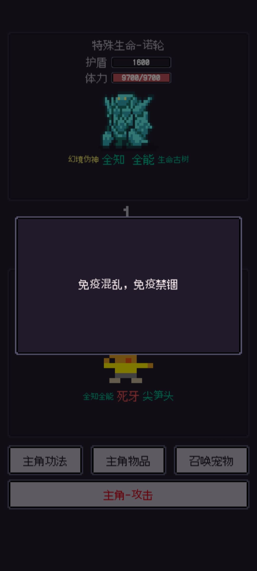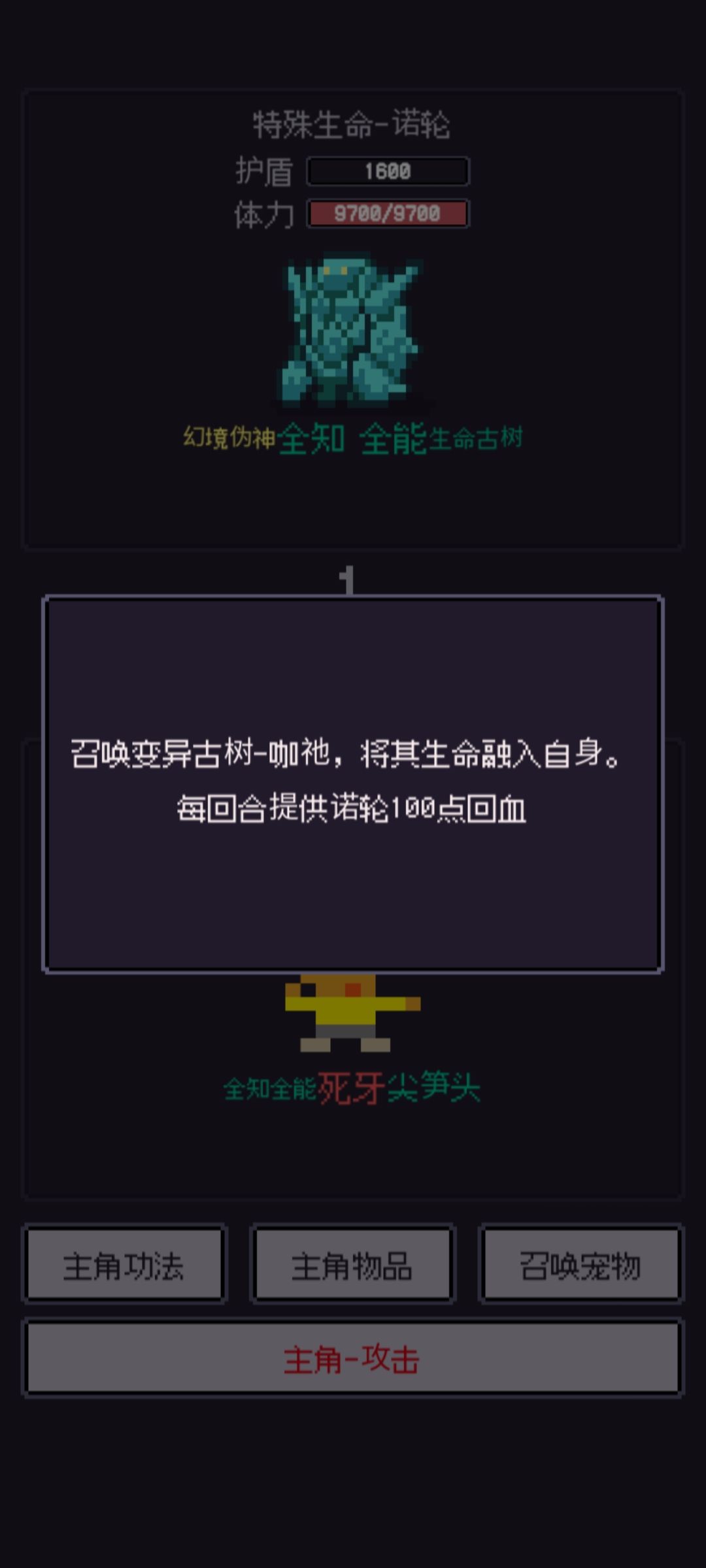 3.这个相当牛啦,变异古树-咖衪:打一下如果先手就是1000多,所以我刷的时候都是存档刷,后手直接死,先手也没什么好说的了直接禁锢到死,而且这个时候可以不破防就需要武器在铁匠铺赋离子切割,就算不破防也打的动