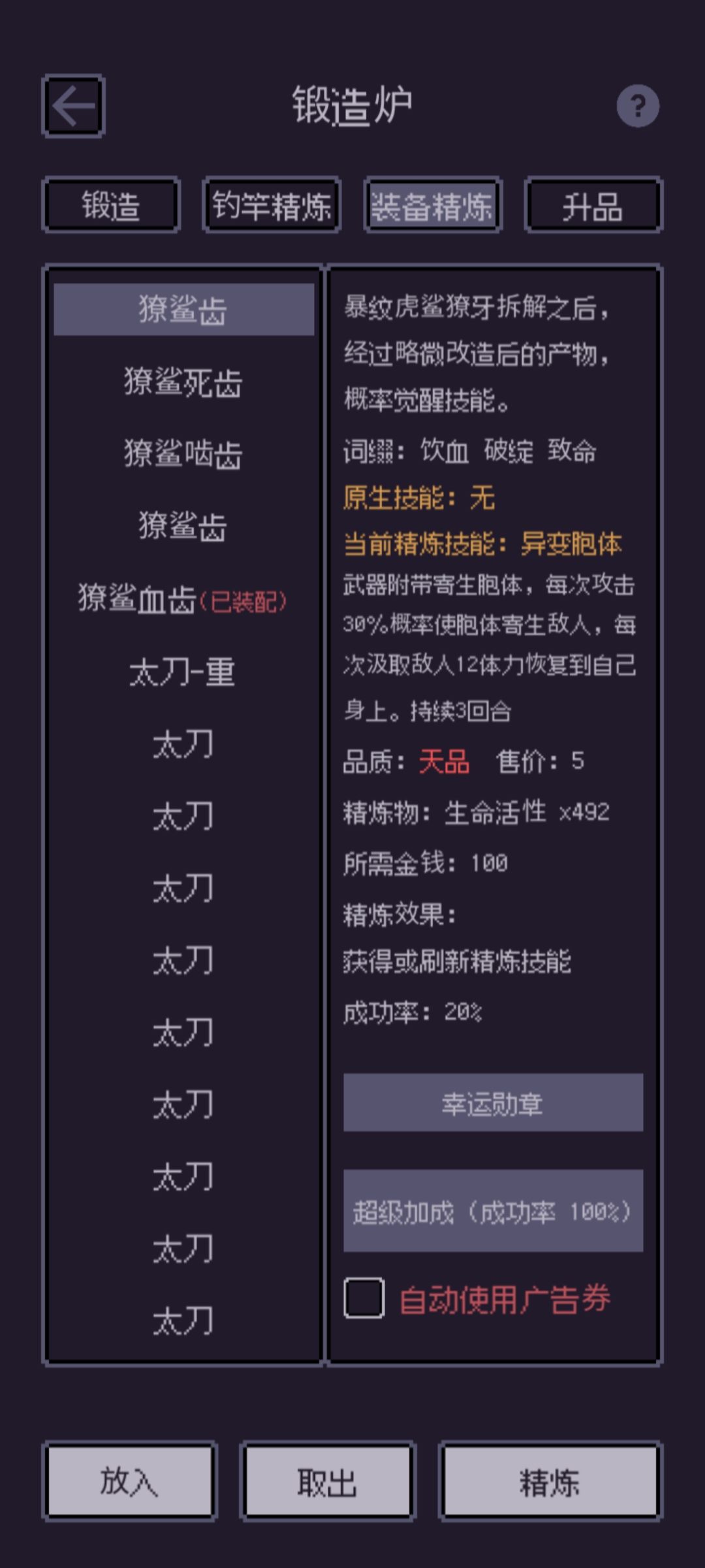 ②我早些时候的方法,武器用第二窍石和生命活性在铁匠铺精炼武器,直到随机到异变胞体这个技能,有了之后刷新手boss拿异变鳞细胞