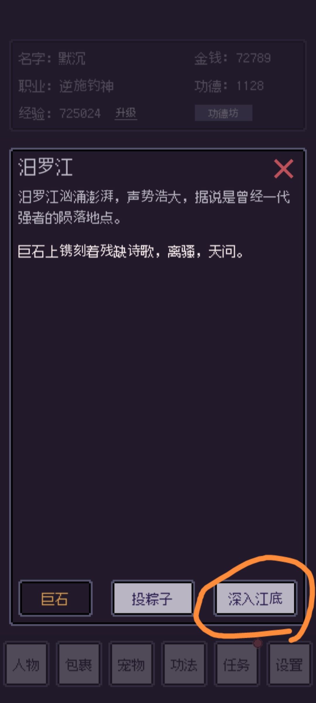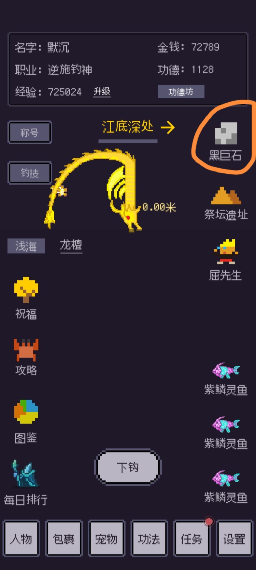 在有避水珠后点泊罗江深入江底可以进入海底,点击黑巨石点躯体给甲壳就能得到boss召唤物啦,避水珠可以与泊罗江的NPC墨启平交易得到(人鱼泪也是号角召唤有奇怪的生物时攻击就行,鱼人会给我们类似混乱的buff新人也很难打),也可以功德坊11功德买