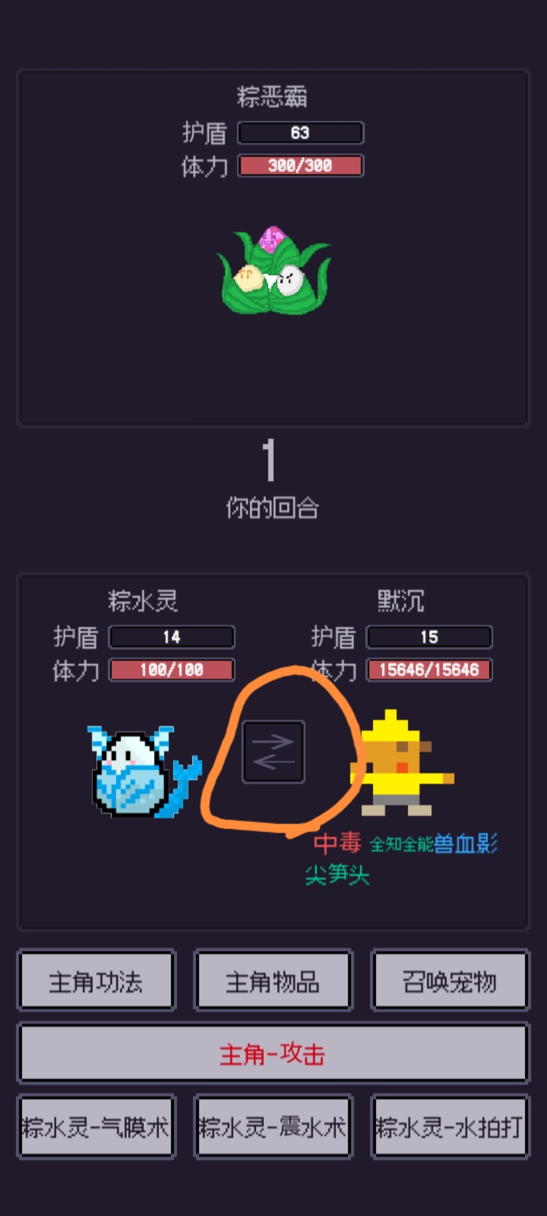 在boss攻击后,第二回合把水粽和主角调回来接着一直打就行到最后应该是主角死了,水粽一下打死(刷之前建议打粽小萌或钓鱼把粽子吃满,之后打会简单一点)