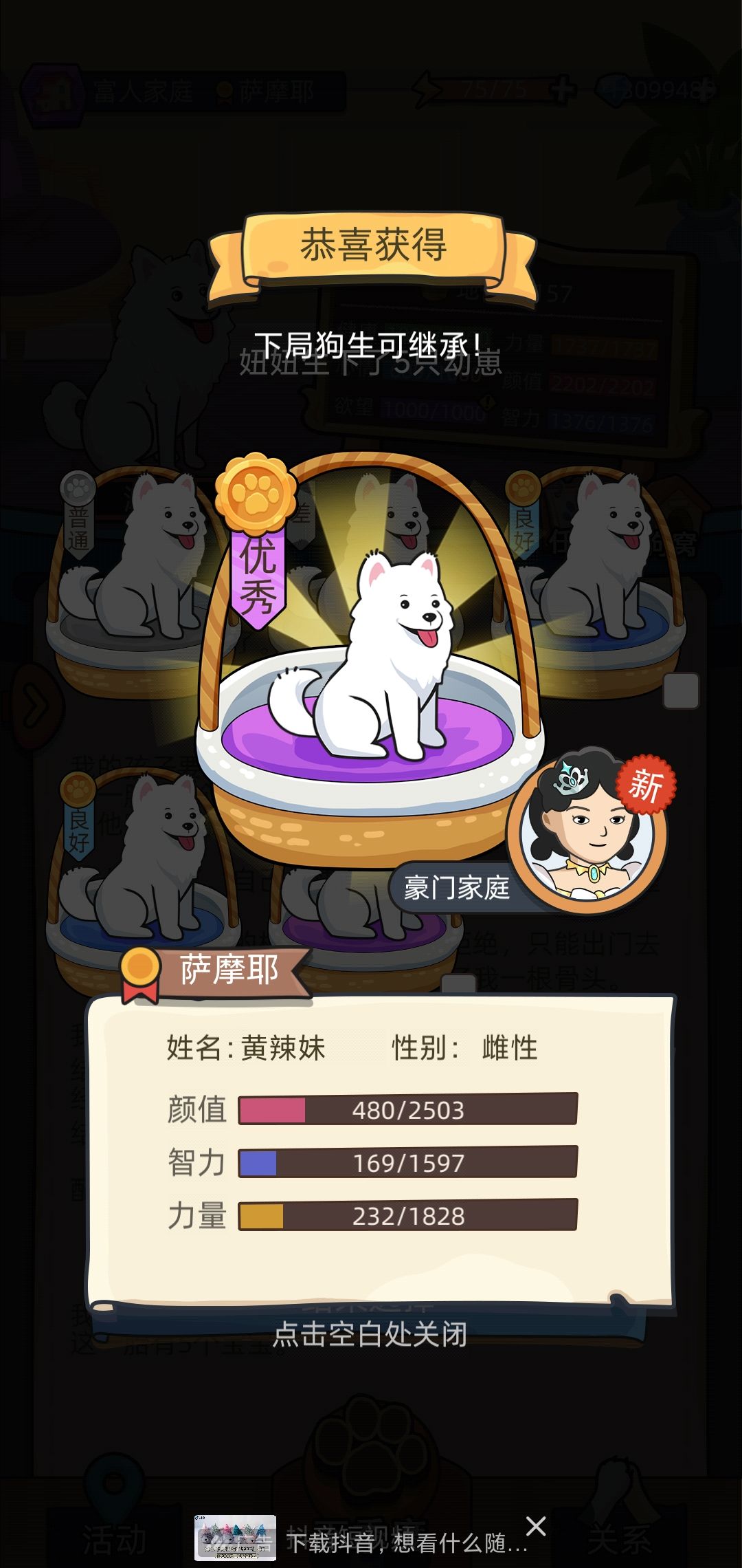 经过一番挣扎之后(主要是反复生了娃就重开),终于来到这一步,中间还生了一只2500的萨摩耶居然是富人我真的吐了,怎么不是大于等于。还好运气好又出一只2503的辣妹给我带到豪门了。不过成就还差好多,等会开始琢磨成就吧